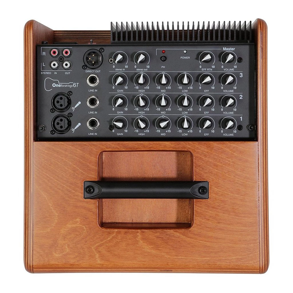 One orStrings 6T is a 130 W acoustic guitar amplifier, equipped with 3 inputs (2 Mic-Line and 1 Line) with Gain / Volume controls, 3-band equalizer, Effect send.