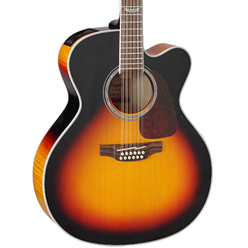Featuring a solid spruce top and flame maple back and sides, the GJ72CE-12 produces all the lush, robust sound that players expect from a jumbo 12-string guitar. The slim mahogany neck and 12″-radius bound laurel fingerboard provide great feel and playability, while the onboard Takamine TK-40D preamp system gives you a built-in tuner, three-band EQ and gain controls, mid contour switch, notch filter and EQ bypass switch for the ultimate in versatility and sound quality.