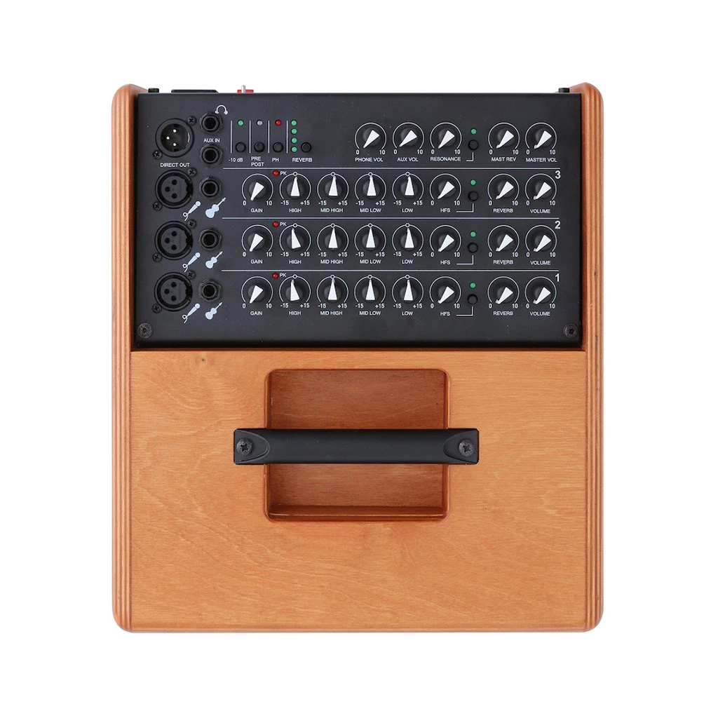 The amplifier is characterized by a exclusive high fidelity audio preamplifier (based on the TSF system), 3 inputs (Mic-line) complete with Peak Led, 4-band equalizer, filter HFS, Effect Send and Volume, Aux input with dedicated Volume, Direct Out (with -10dB and PRE / POST) and manual “feedback canceled” filter.