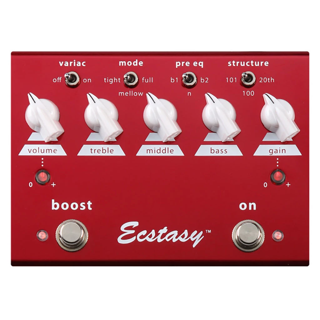 Reinhold designed the Ecstasy red pedal with five discrete Class A gain stages and with no op-amps or diode clipping, mirroring the circuitry of the Ecstasy amplifier’s red channel. This revolutionary approach provides clarity, touch sensitivity and note separation never before achieved in overdrive pedals.