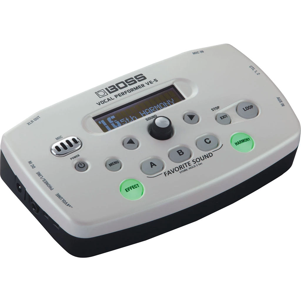 The VE-5 Vocal Performer is a compact and mobile personal effects processor and looper for vocalists. Featuring a simple-to-use tabletop design that can be easily attached to a mic stand for performing, the VE-5 is perfect for singers, rappers, beatboxers, webcasters, and anyone that wants to have fun with processing vocal sounds. Its physical design is small and light, yet its effects are heavyweight class, derived from the popular VE-20 Vocal Performer. With battery operation and built-in phrase looping, the VE-5 is also an ideal tool for street performers who want to bring a new dimension of creativity to their act.