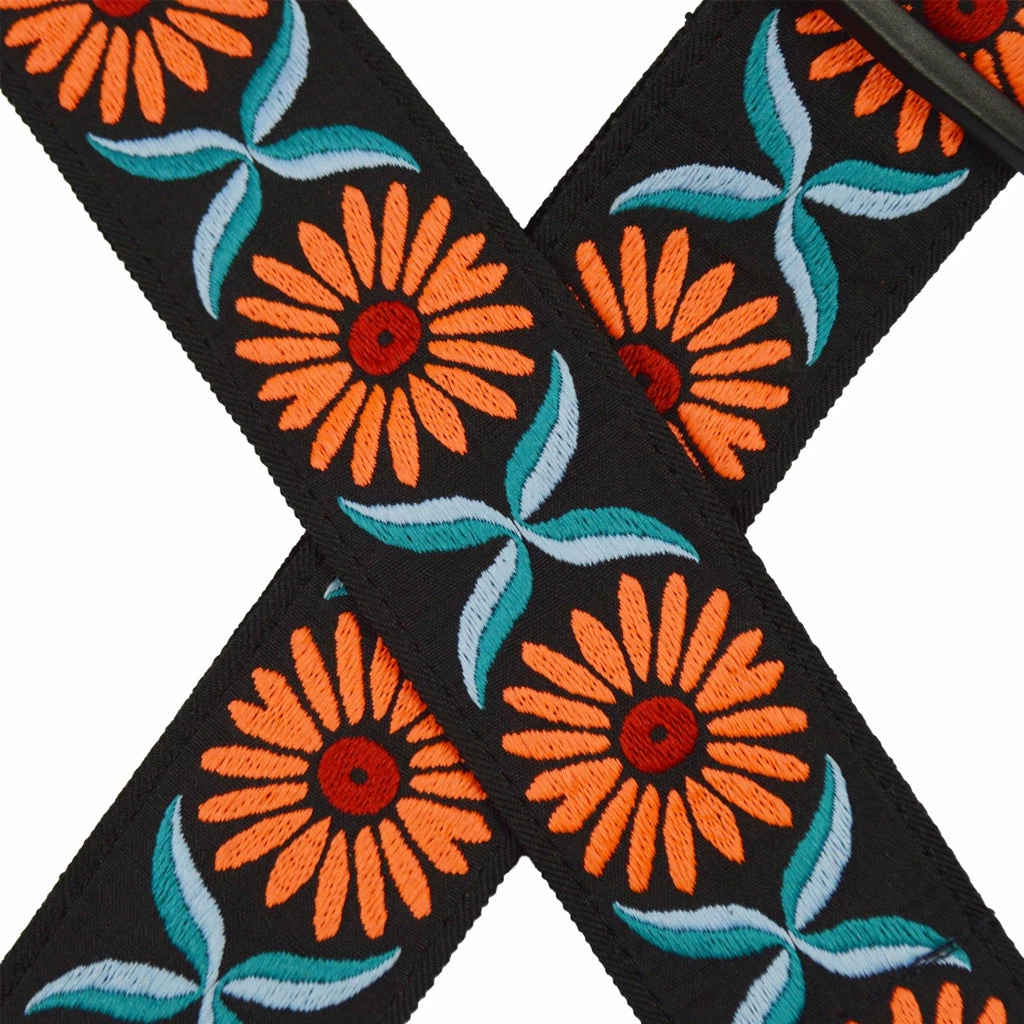 Orange Daisy jacquard sewn onto 50mm webbing.