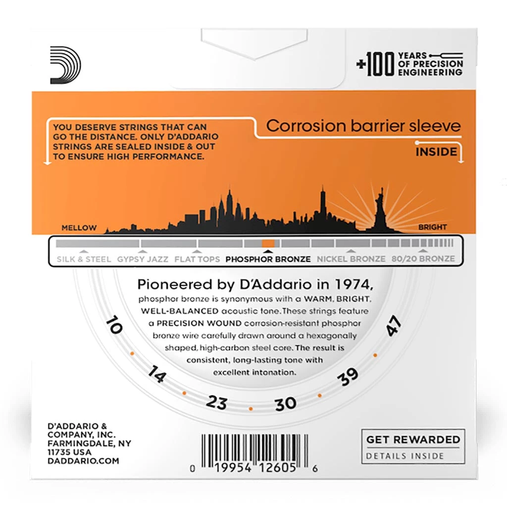 Phosphor Bronze was introduced to string making by D’Addario in 1974 and has become synonymous with warm, bright, and well balanced acoustic tone. D’Addario Phosphor Bronze strings are precision wound with corrosion resistant phosphor bronze onto a carefully drawn, hexagonally shaped, high carbon steel core. The result is long lasting, bright sounding tone with excellent intonation.
