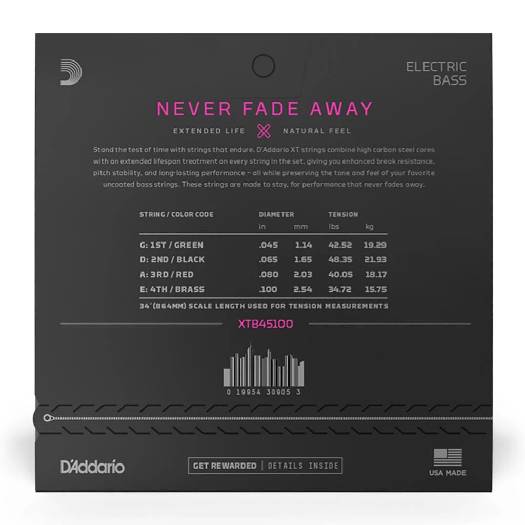 D’Addario XT Bass Nickel Plated Steel strings combine our most popular electric bass guitar alloy with an advanced corrosion resistance treatment on every string in the set, preserving the natural tone and feel of uncoated strings. Available in a variety of gauges for 4 and 5 string, long scale basses.