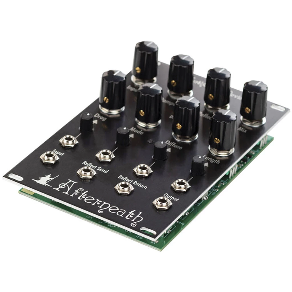 The Afterneath Eurorack Module brings the Otherworldly sounds from the effects pedal world right into your modular synthesizer with an expanded feature set. The Afterneath module features one main audio input, one main audio output, an audio send and return for the Reflect feedback path, and nine controls. Four of the parameters are controllable via CV, and each has been equipped with a dedicated attenuverter to process the incoming CV. The Afterneath module has a completely analog dry signal path and a totally digital wet signal path.