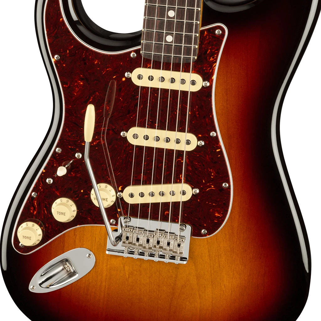 Our popular Deep “C” neck now sports smooth rolled fingerboard edges, a “Super-Natural” satin finish and a newly sculpted neck heel for a supremely comfortable feel and easy access to the upper register. New V-Mod II Stratocaster single-coil pickups are more articulate than ever while retaining bell-like chime and warmth. An upgraded 2-point tremolo with a cold-rolled steel block increases sustain, clarity and high-end sparkle.
