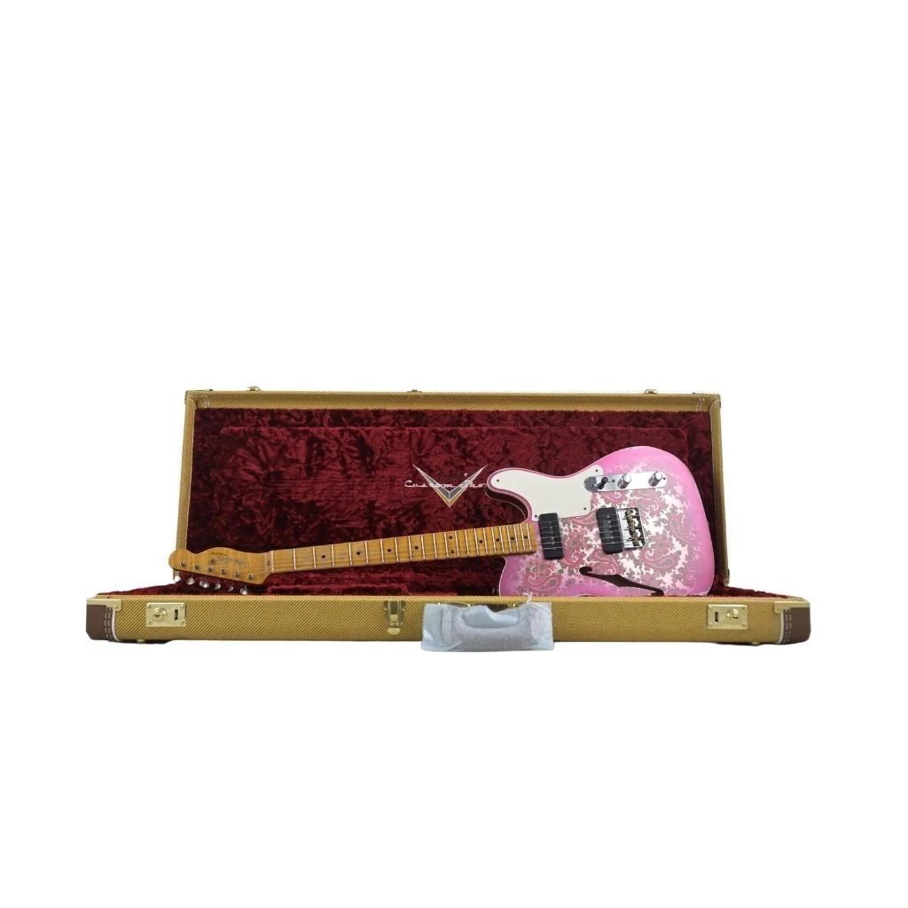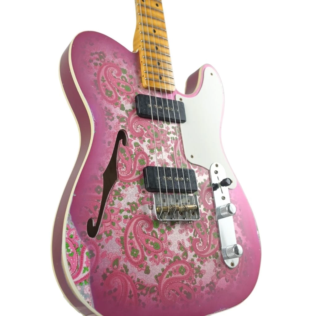 The Fender Custom Shop limited edition dual P90 thinline Telecaster relic guitar. This features an ash body, quartersawn maple neck, maple fretboard, narrow tall frets, and equipped with custom shop P90 pickups, custom bridge, and vintage tuners in a pink paisley finish.