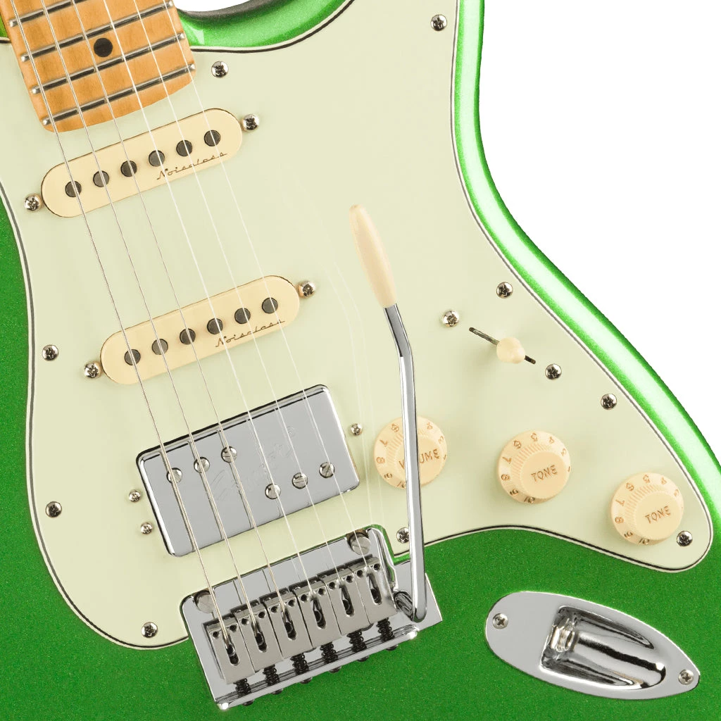 Fusing classic Fender design with player-centric features and exciting new finishes, the Player Plus Stratocaster HSS delivers superb playability and unmistakable style. The powerful Player Plus humbucking pickup delivers the perfect balance of gain and definition, while the Player Plus Noiseless Strat® pickups are bright and touch sensitive, offering classic Strat tone without hum. A push-pull tone controls activate coil-split mode for the humbucking pickup, delivering crystal-clear single-coil tones. The silky satin Modern “C” Player Plus Strat® neck fits your hand like a glove, with smooth rolled edges for supreme comfort. The 12” radius fingerboard and 22 medium jumbo frets facilitate fluid leads and choke free bends. Smooth and responsive, the 2-point tremolo provides classic vibrato effects, while the locking tuners provide rock-solid tuning and make string changes quick and easy. With classic Fender style, advanced features and stunning new finishes, the Player Plus Stratocaster HSS is the perfect tool to spark your creativity and stand out from the crowd.