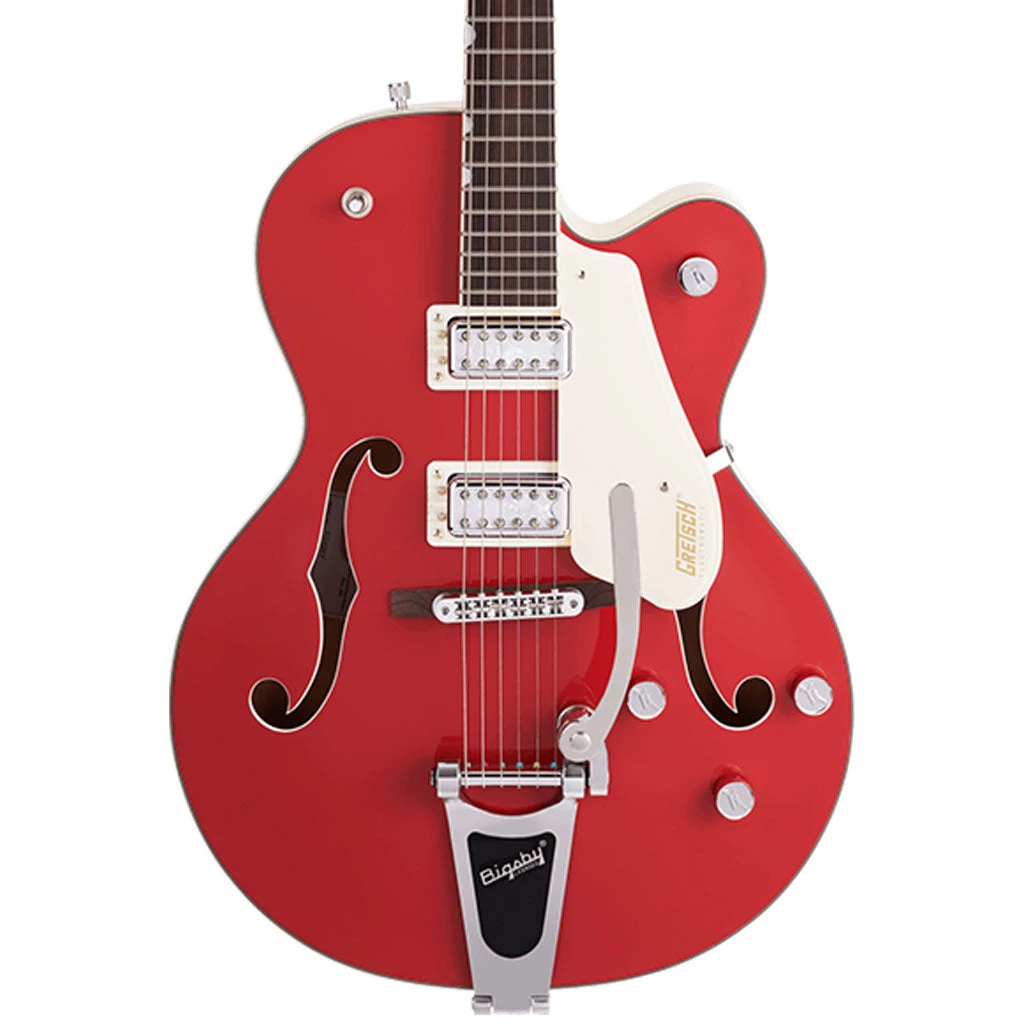 Boasting that ’50s California high-end vibe, the G5410T is decked out in three radiantly cool finishes—Two-Tone Fiesta Red and Vintage White with vintage white pickguard, Two-Tone Ocean Turquoise and Vintage White with vintage white pickguard, and Two-Tone Vintage White and Casino Gold with gold pickguard.