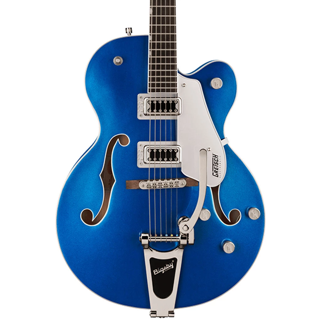Alive and resonant, the G5420T also features a versatile upgraded control layout including master volume with treble bleed circuit, master tone, individual pickup volume controls and three-position pickup toggle switch, oversized bound F-holes, multi-ply body binding, smaller late-’50s G6120 bound headstock, vintage-style open-back tuning machines, Graph Tech® NuBone® nut, pearloid Neo-Classic™ thumbnail inlays, secured Adjusto-Matic™ bridge and a Bigsby® B60 vibrato tailpiece.