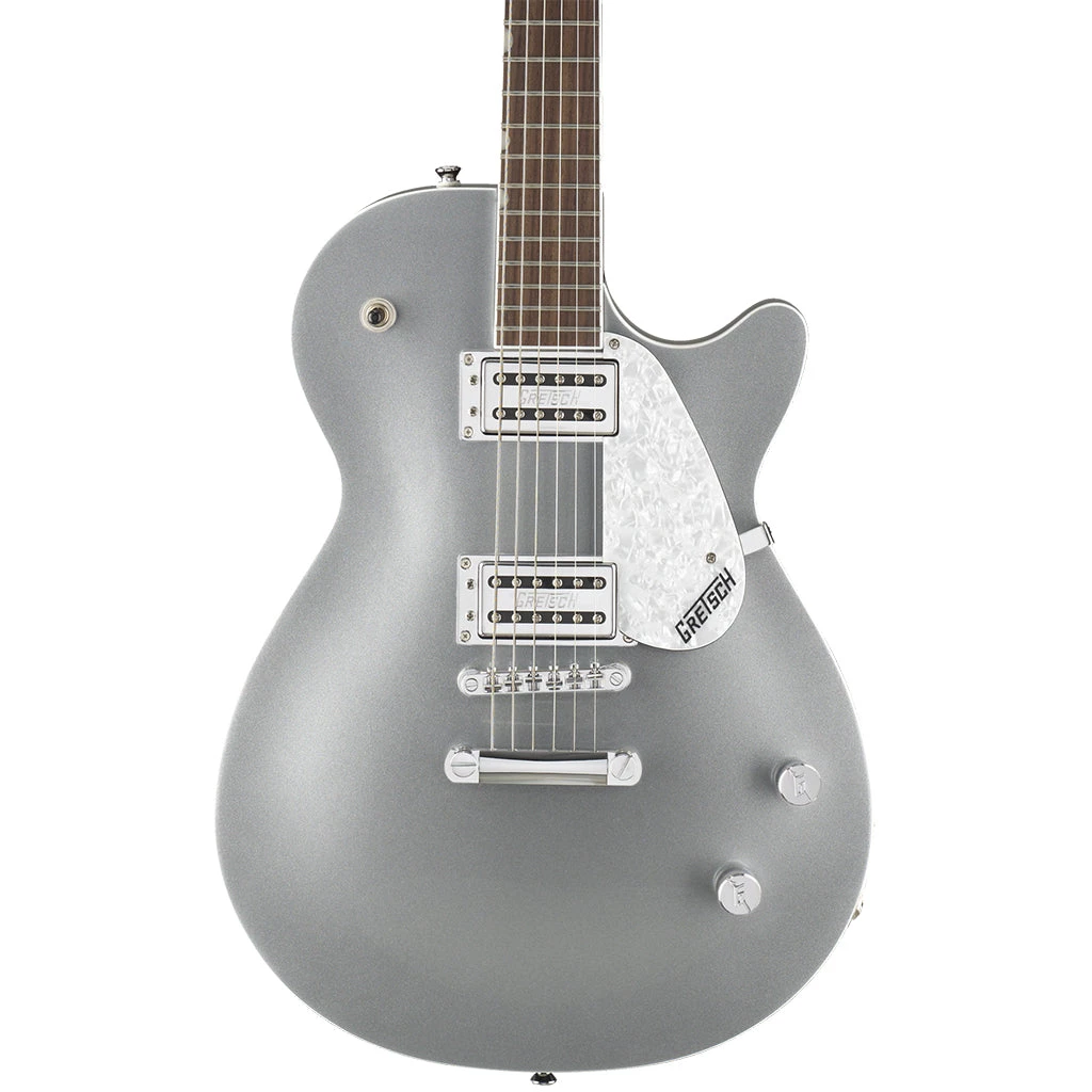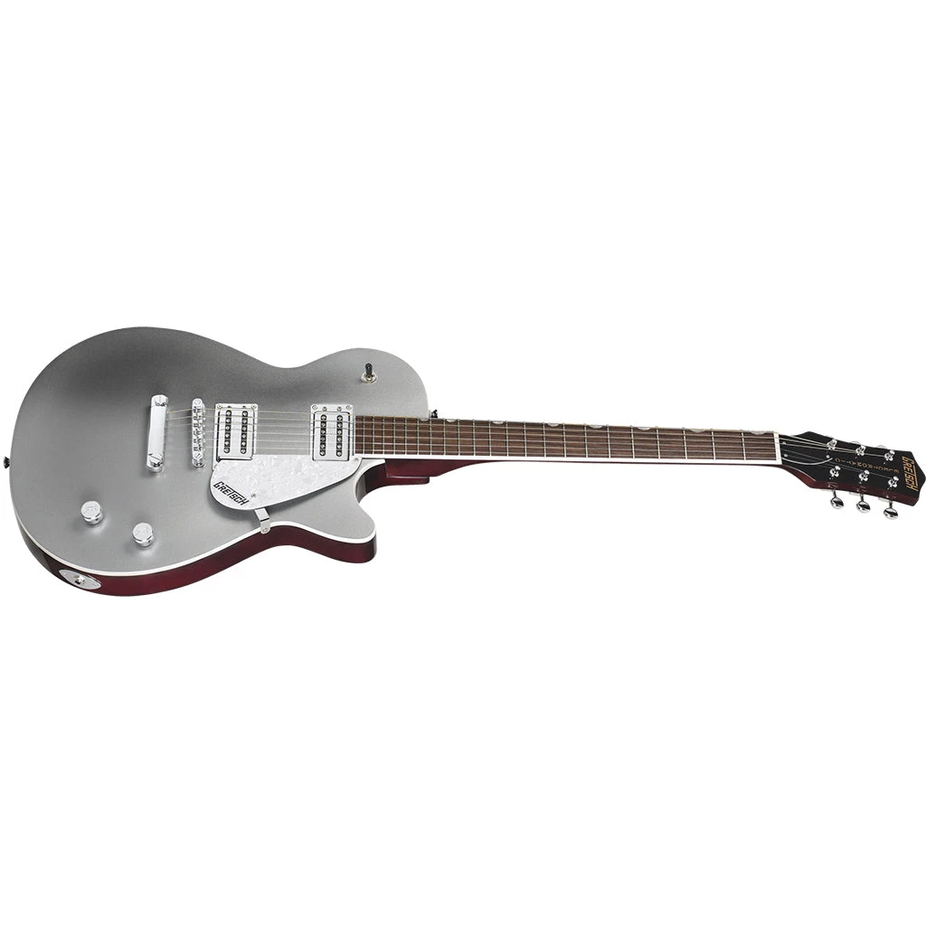 The G5425 Jet Club has a single-cutaway chambered basswood body with an arched maple top that resonates true to “That Great Gretsch Sound™,” with a two-tone body color scheme (Black or Silver top with Walnut-stained back and sides). Features include Gretsch dual-coil humbucking pickups that ensure luscious tone, 22 medium jumbo frets, anchored Adjusto-Matic™ bridge and stop tailpiece that ensure vibrant sustain, Neo-Classic™ thumbnail fingerboard inlays, G-arrow knobs and white pearloid Gretsch-logo pickguard.