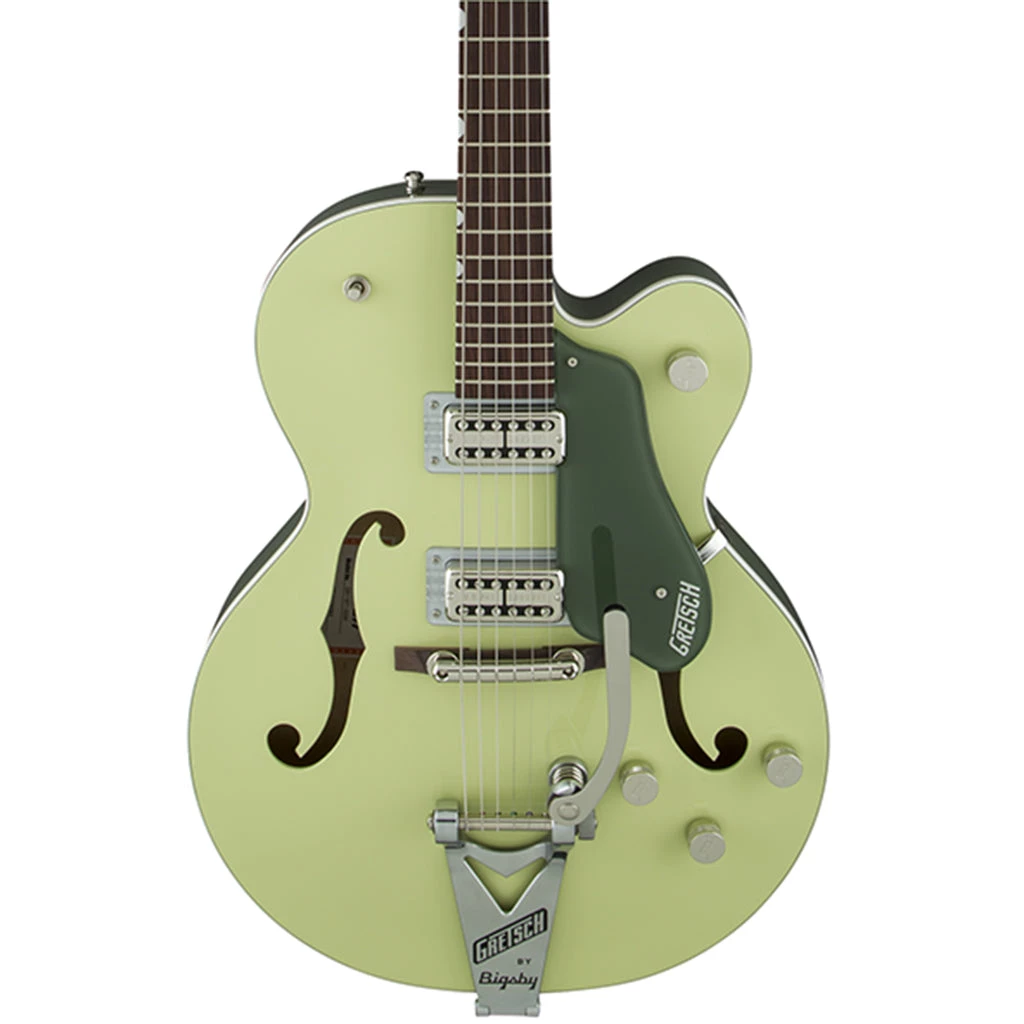 A finely tuned modern music machine offered in either 2-Tone Smoke Green or 2-Tone Lotus Ivory and Charcoal Metallic, this guitar features the appointments Gretsch fans desire—nickel G-arrow control knobs, white binding with black purfling, gloss urethane finish, pearloid thumbnail inlays, vintage thick plexi pickguard with Gretsch logo and Schaller® locking tuning machines. Let loose the fury and power of rock with the G6118T Players Edition Anniversary with String-Thru Bigsby—big sound meets bold, brash style.