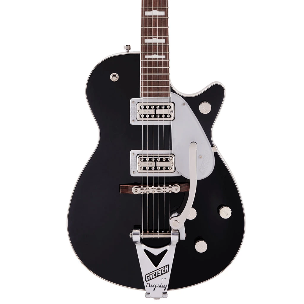 Other features include a set maple neck, 12”-radius rosewood fingerboard with pearloid Hump Block inlays, bone nut, G-arrow knobs, Bigsby® vibrato tailpiece, Adjusto-Matic™ bridge with pinned rosewood base and Gotoh® tuners.
