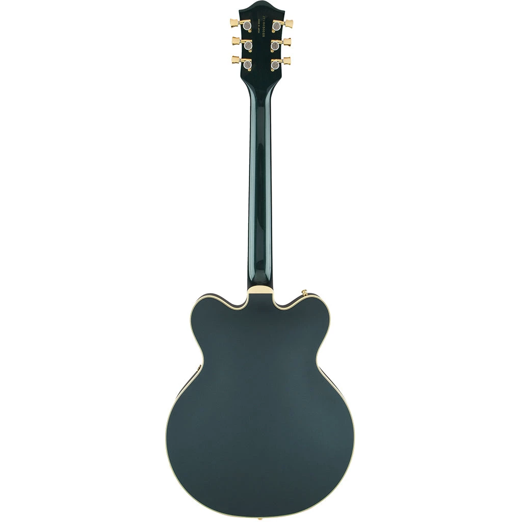 Built to perform, the G6609TG Players Edition Broadkaster® Center Block Double-Cut with String-Thru Bigsby® and Gold Hardware features a double-cutaway body in handsome Cadillac Green and Vintage White finishes, both with gleaming gold hardware. These models feature the all-new U.S.-made Full’Tron™ pickups that deliver full-spectrum sonic range with distinctive snarl, in addition to classic Gretsch chime, balance and brilliance with slightly more pronounced mid concentration that brings even more tonal muscle to full-volume playing with overdrive and distortion.