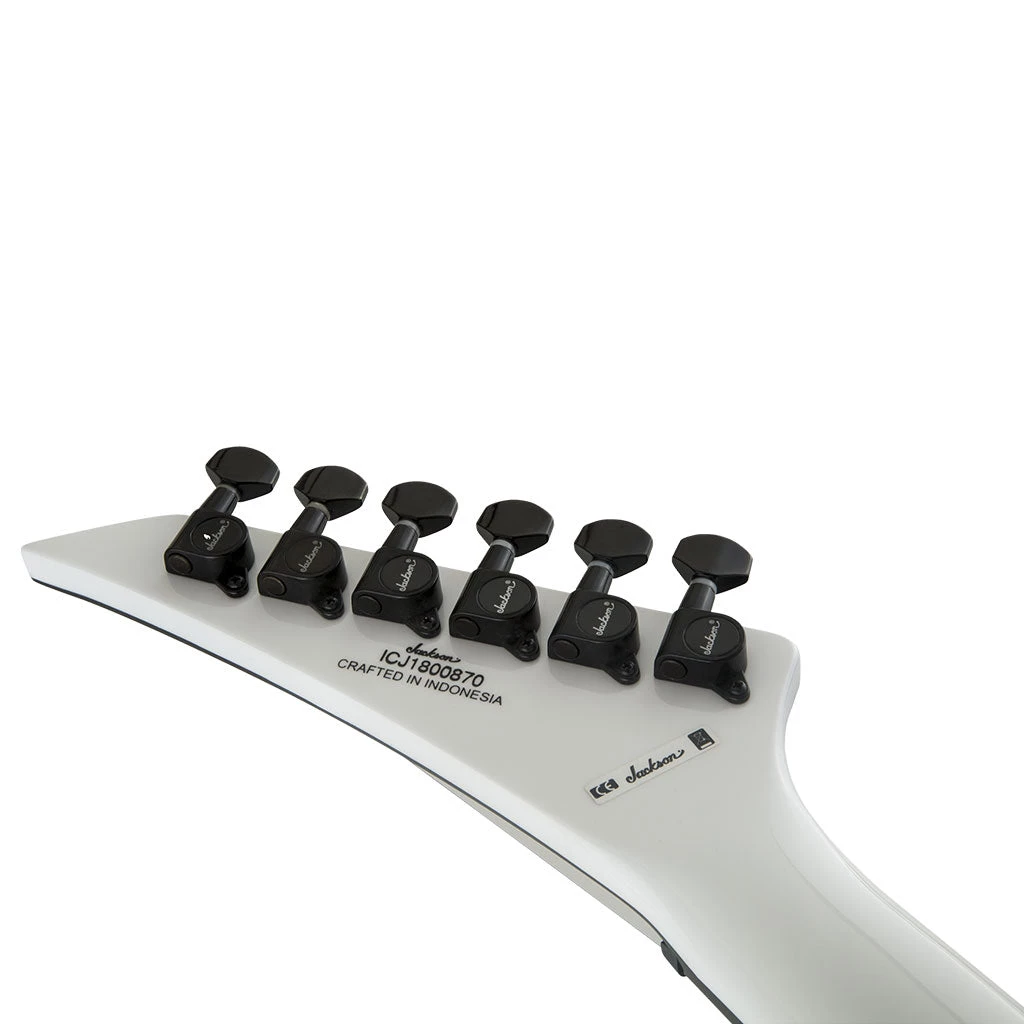 This axe also features dual volume knobs, three-way toggle switch, Jackson TOM-style adjustable string-through-body bridge, Dunlop® dual-locking strap buttons and Jackson pointed 6-in-line headstock.