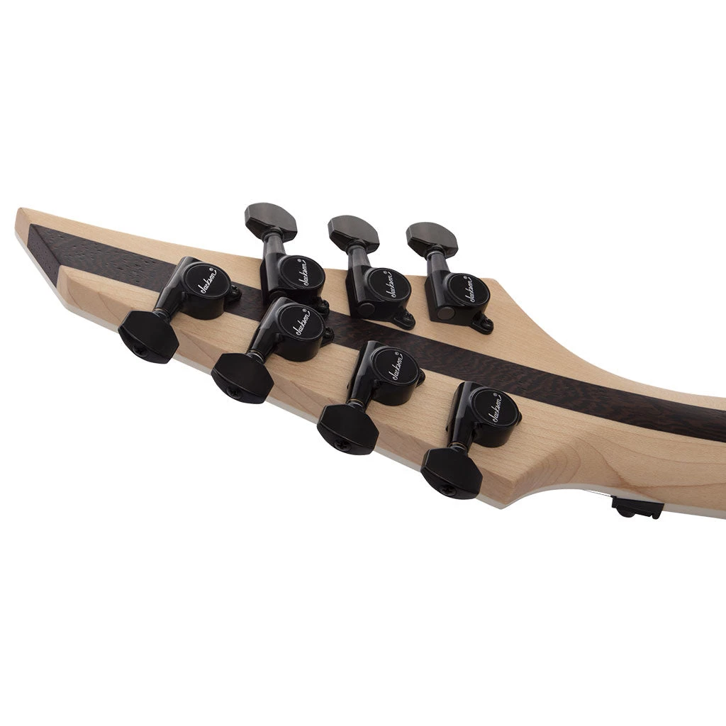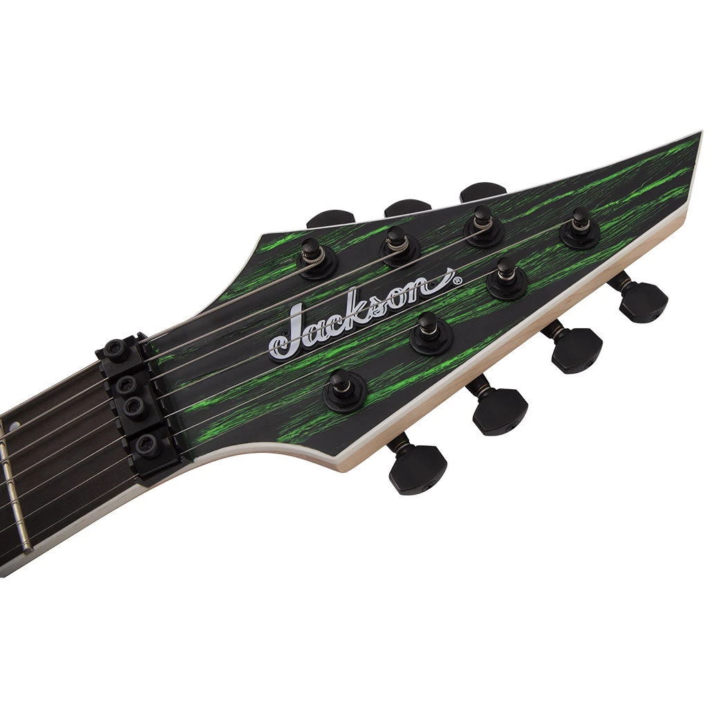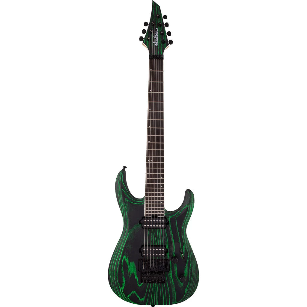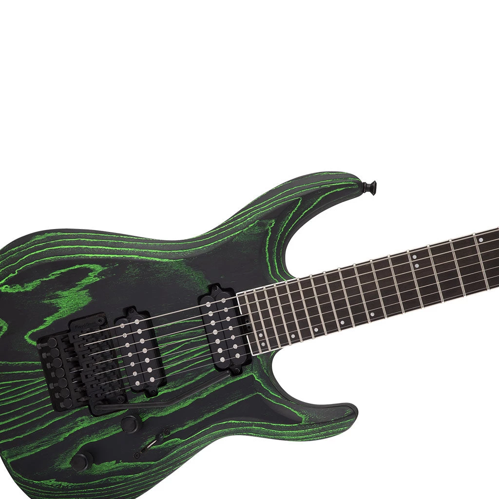 Featuring a 26.5” scale length, this modern 7-string guitar also boasts unparalleled style with a sandblasted surface that highlights the ash wood grain and otherworldly Baked Green finish, complete with a reverse 3×4 AT-1 matching headstock with white Jackson badge logo and black hardware.