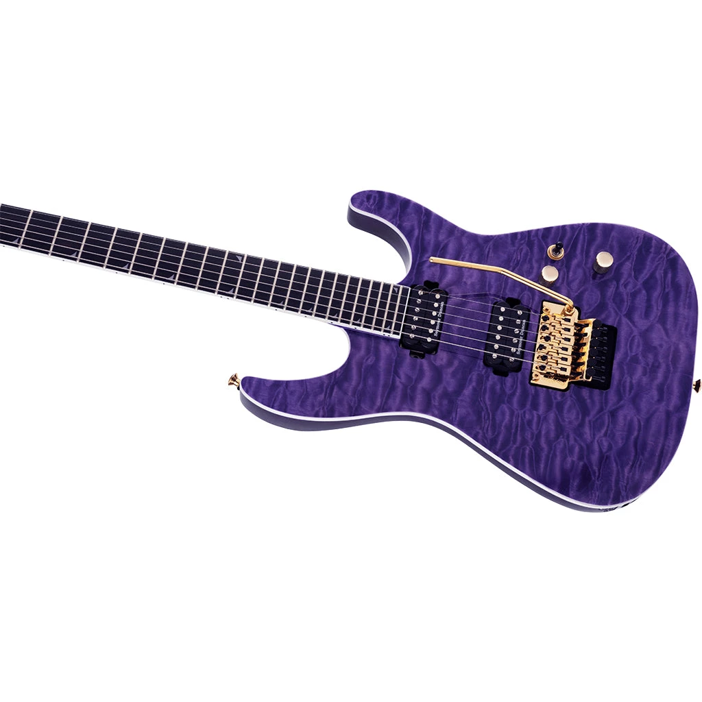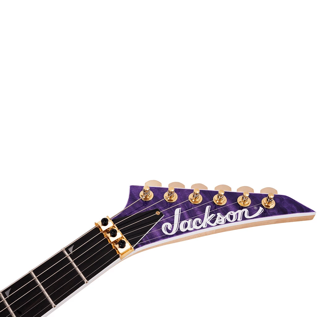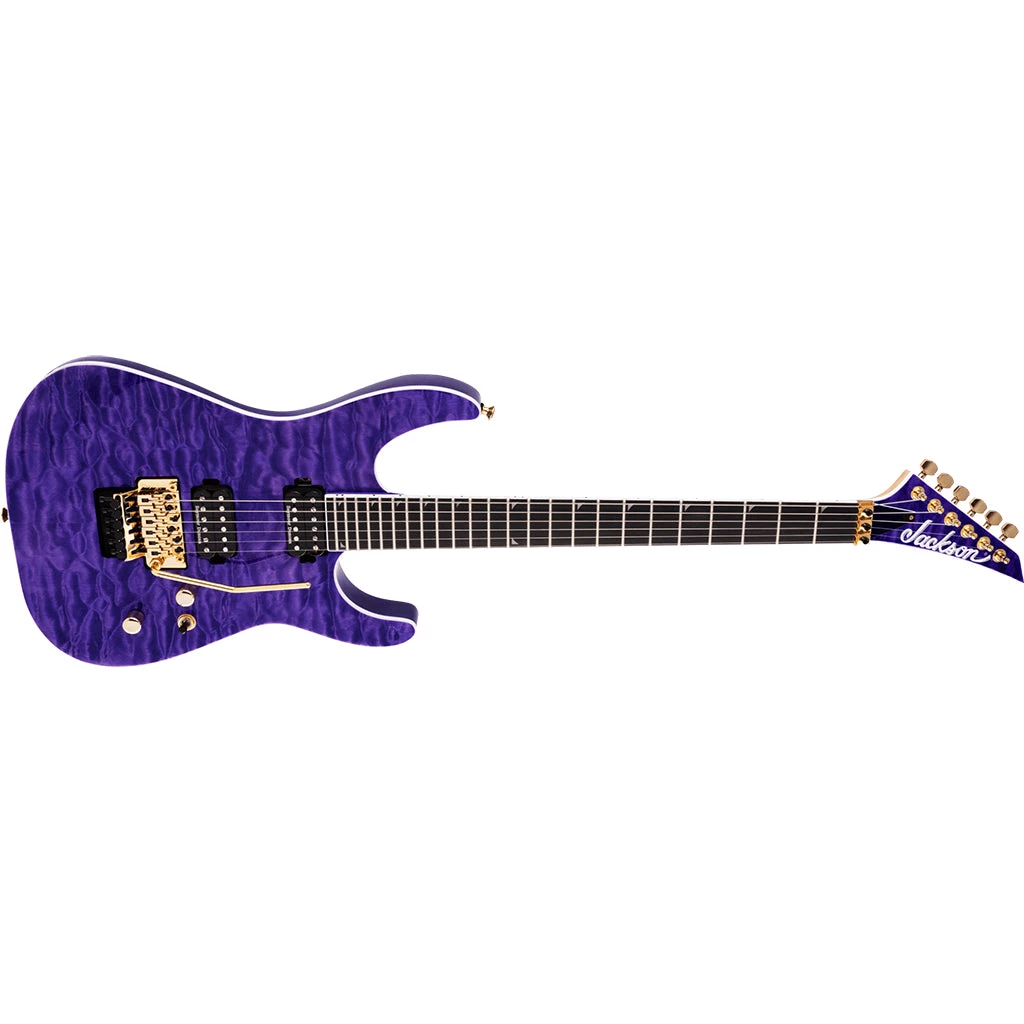 Unlock your full potential as a player with the innovative Jackson® Pro Series Soloist™ SL2Q MAH, the final word in high-tech guitar design. A high-performance evolution of the electric guitar, this ergonomic instrument opens up new horizons of playability, resetting the bar of what’s possible in guitar design. The Pro SL2Q MAH’s premium features include a mahogany body with quilt maple top and a through-body maple neck with scarf joint and hand-rubbed oil finish on the back for smooth playability and comfortability, as well as graphite-reinforcement rods that provide stability to guard against temperature- and humidity-induced bending and warping. Its 12”-16” compound radius bound ebony fingerboard with 24 jumbo frets is designed for highly technical lightspeed playing—more curved by the nut for comfortable chording, it flattens out as you move up the neck for increasingly fast playing speed and wide bends without fretting out. Designed for aggressive playing styles, modern Seymour Duncan® Distortion™ humbucking bridge and neck pickups combine for highly balanced, flexible tone, with plenty of high output while retaining clarity. Think pristine cleans, crunchy rhythms, snarling distortion and searing leads. Explore this instrument’s versatile voice with three-way pickup toggle switching and single volume and tone controls, and dive and soar expressively with the Floyd Rose® 1000 Series double-locking tremolo bridge system, recessed for pick hand comfort and providing laser-accurate intonation and ultra-stable tuning.