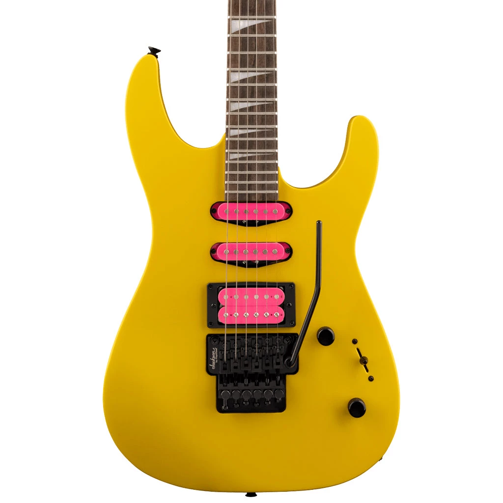 Captivating in both sound and style, the X Series Dinky DK3XR HSS is dressed in Caution Yellow or Neon Pink with a color matched reverse Jackson pointed 6-in-line headstock and black hardware. The Caution Yellow finish also features pink pickup bobbins and pink Jackson headstock logo, while the Neon Pink features pink pickup bobbins and a black Jackson headstock logo.