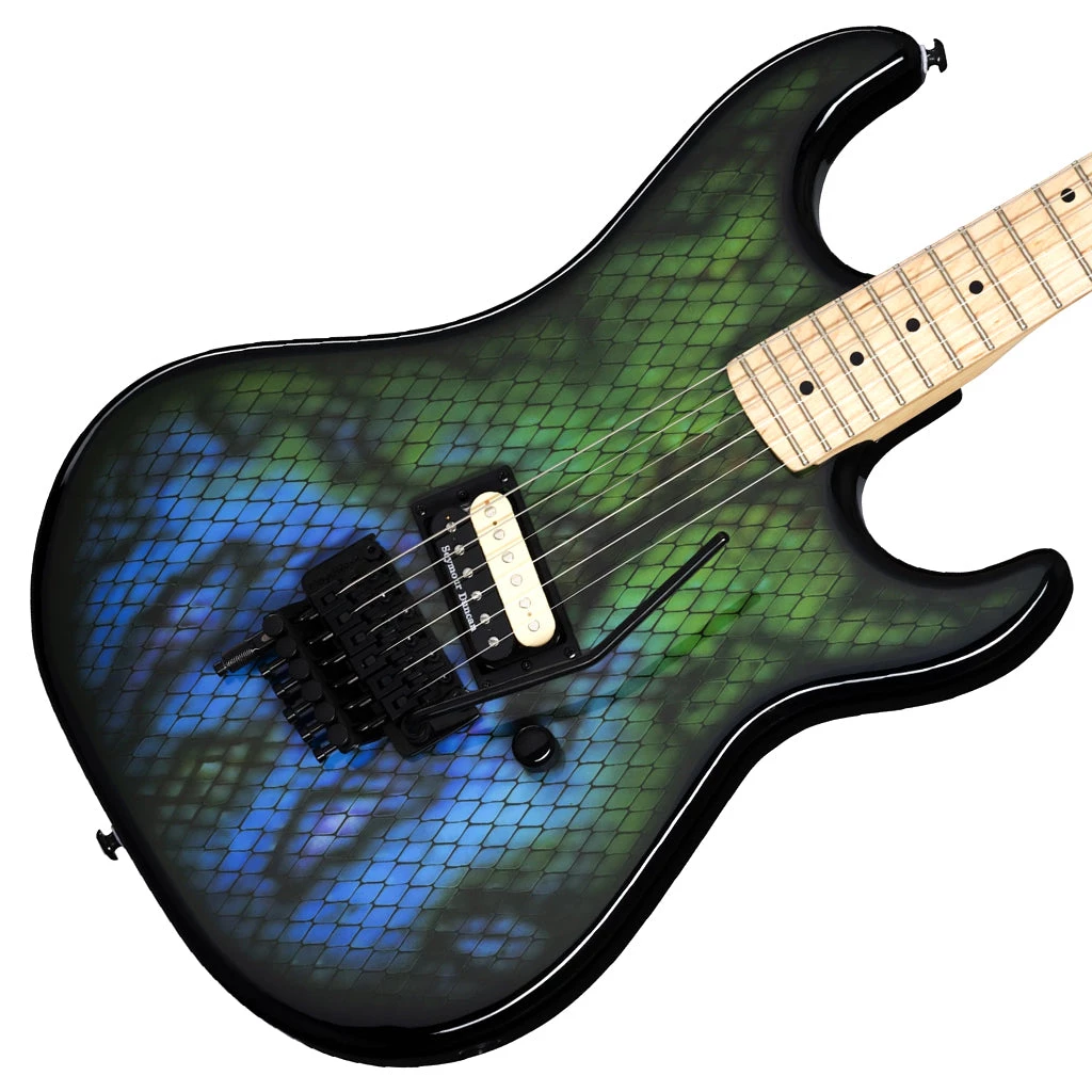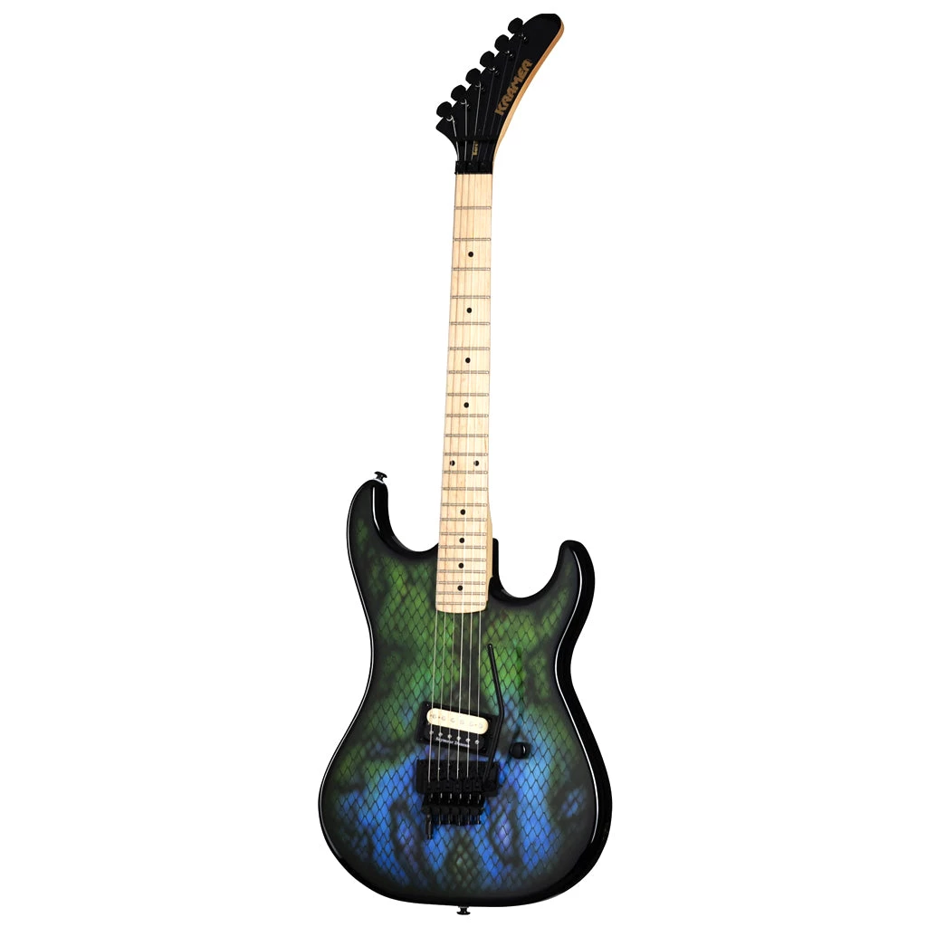 Retro fashion trends wouldn’t be complete without some snakeskin, and this Baretta, with “Viper” graphics designed by Kramer Custom Graphic Artist Chris Stemmer, really delivers! Shredders chose to rock snakeskin boots, belts, and, of course, snakeskin Kramers! The Baretta is a tribute to one of the most iconic and original guitar designs in rock. Features an alder body, satin-finished hard maple neck, a single Seymour Duncan® JB™ zebra-coil humbucker, and a Floyd Rose® 1000 series tremolo with an R2 1000 series locking nut. It also comes equipped with an EVH® D-Tuna® and a Floyd Rose LRT-L40 Trem Stop, and it is finished in an eye-catching Snakeskin Green Blue Fade. A premium gig bag is also included.