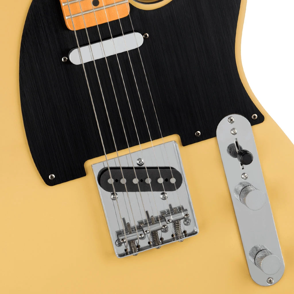 The Squier® 40th Anniversary Telecaster®, Vintage Edition is a soulful tribute model trimmed with a collection of classic features for the retro-minded Squier enthusiast. Featuring aged chrome hardware, an anodized aluminum pickguard, a vintage-tinted maple neck, an engraved anniversary neck plate and satin finish throughout, this Tele® honors the heritage of the Squier catalog and its ancestry. Player-friendly refinements of this commemorative model include a slim and comfortable “C”-shaped neck profile for an easy playing feel, vintage-style tuning machines and 3-saddle string-through-body bridge for authentic performance and style, and Fender-Designed single-coil pickups with alnico 5 magnets for familiar Tele tone.
