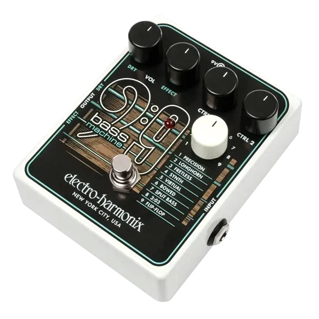 The polyphonic BASS9 Bass Machine transforms a guitar into nine different basses and requires no special pickups, MIDI or instrument modifications. It relies on the same technology powering all EHX 9 Series pedals, like the award winning MEL9® Tape Replay Machine, but features a new algorithm maximized for transposing one to two octaves down with superior dynamics and tracking.