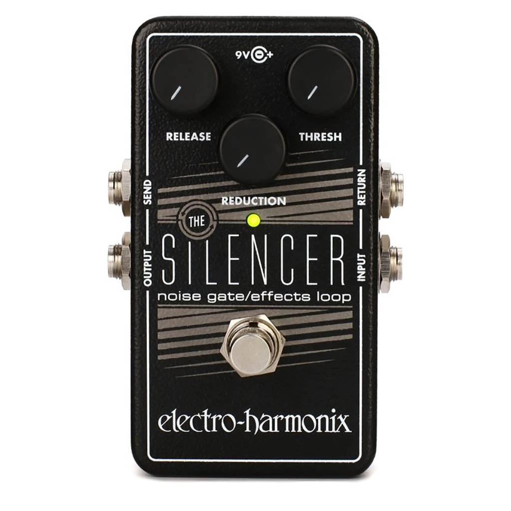 I/O includes ¼ inch Input, Output, Send and Return jacks. The footswitch selects whether The Silencer is engaged or in bypass mode; buffered bypass allows the effects loop to remain in your signal path when the gate is bypassed. A built-in AC jack accepts a standard power supply like the EHX 9.6DC unit (optional) and the pedal comes with a 9V battery.