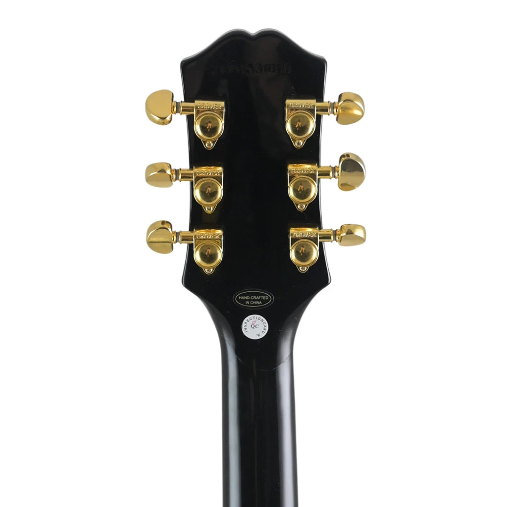 The new Les Paul Custom is part of Epiphone’s Inspired by Gibson Collection and honors the 1950s classic designed by Mr. Les Paul himself in 1954 as the “tuxedo” version of his groundbreaking solid body masterpiece. Featuring the traditional Custom bound all-mahogany body, 60s SlimTaper™ neck profile, ebony fingerboard with block inlays, gold Epiphone LockTone™ Tune-O-Matic™ bridge and Stop Bar tailpiece, a pair of critically acclaimed Epiphone ProBucker™ humbuckers, and Custom split-diamond inlay on the headstock. This Epiphone Inspired by Gibson model also has the 60s style Kalamazoo headstock, rolled neck for a comfortable feel, Graph Tech® NuBone® nut, era-appropriate wiring, and CTS® pots. Optional hardshell or EpiLite Case is available.
