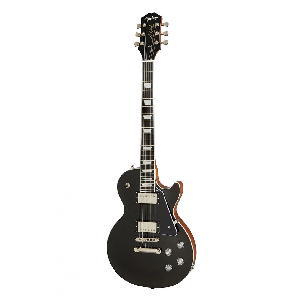 The new Inspired by Gibson™ Epiphone Les Paul™ Modern incorporates many contemporary updates that players have embraced such as a lighter-weight body and innovative SlimTaper™ neck with an asymmetrical profile. The neck/body joint features the new Modern contoured heel for effortless access to the highest frets as well as maximum sustain and stability. Upgrades include an ebony fretboard, Grover® locking Rotomatic® tuners, Graph Tech® nut, clear Top Hat knobs, and ProBucker™ pickups. The control assembly features the treble bleed circuit to keep your highs sparkling when turning your volume down, 3 push-pull pots to switch between the humbucker™ and the single-coil sounds, and phase switching for the most versatile and sonic variety. The new Epiphone Les Paul Modern is here to shape the sound for future generations. Available in Vintage Sparkling Burgundy, Graphite Black, and Faded Pelham Blue finishes. Optional hardshell and EpiLite™ cases sold separately.