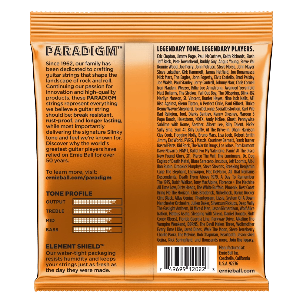 Ernie Ball Slinky Paradigm Electric guitar strings provide unprecedented strength and longer life while retaining 100% Slinky tone and feel. Ernie Ball’s industry leading ultra-high strength steel is included in both the wound and plain strings along with a patented reinforcement at the ball end twist of each plain string to provide superior tensile and fatigue strength for strings that lock into tune fast and hold up under the most stressful playing styles and conditions. The coupling of Ernie Ball’s Everlast nanotreatment with breakthrough plasma enhanced wrap wire provides added corrosion resistance and reduced accumulation of tone-robbing buildup and debris. Experience the first set of longer lasting strings that are worth playing with all benefits and no compromises. Gauges .009, .011, .016, .026, .036, .046