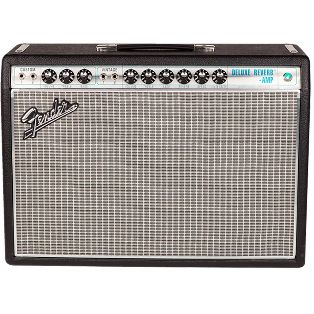 The ’68 Custom Deluxe Reverb Amp pays tribute to the classic look, sound and performance of Fender’s late-’60s “silverface” amps. In a special twist, both channels boast reverb and tremolo, and the “custom” channel has a modified Bassman® tone stack that gives modern players greater tonal flexibility with pedals. The amp also features quicker gain onset and reduced negative feedback for greater touch sensitivity. The ’68 Custom Deluxe Reverb’s single 12” Celestion® G12V-70 speaker also delivers a more distinctively rock ‘n’ roll flavor.