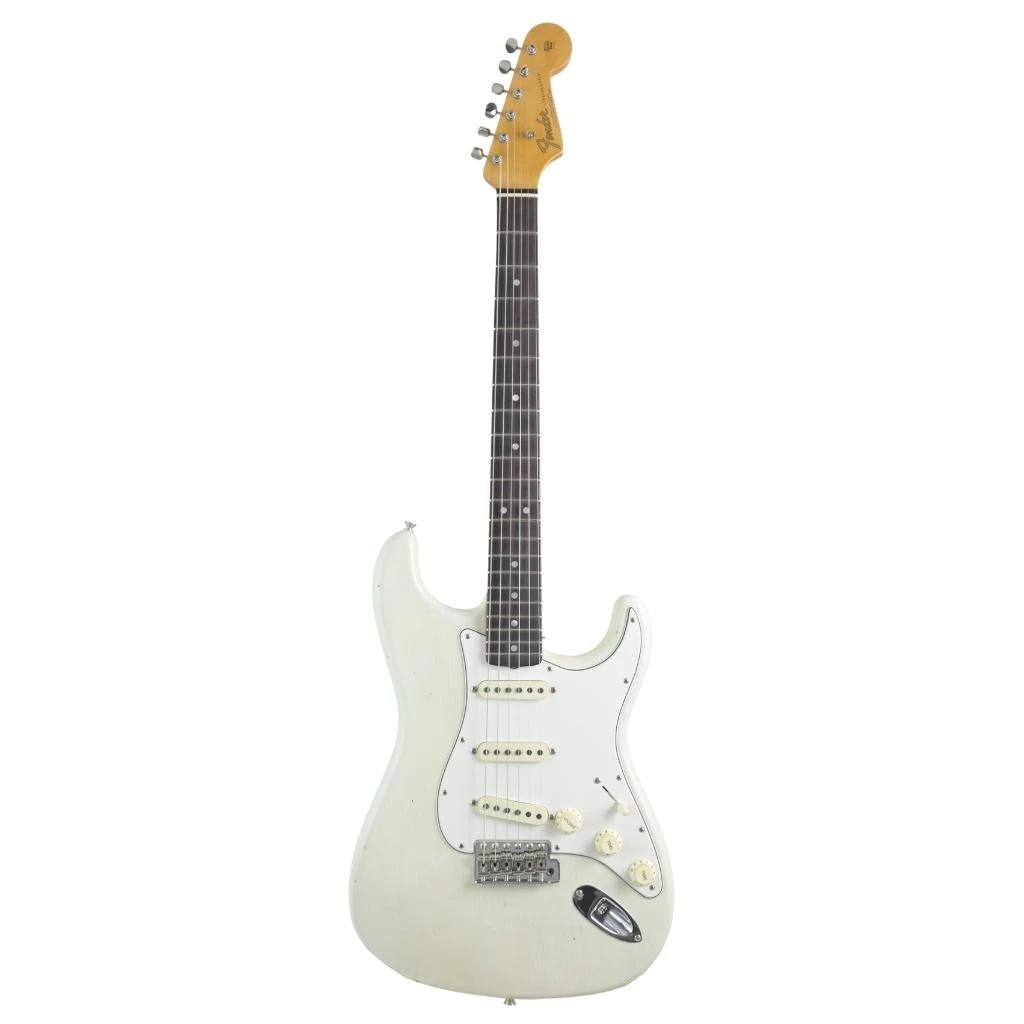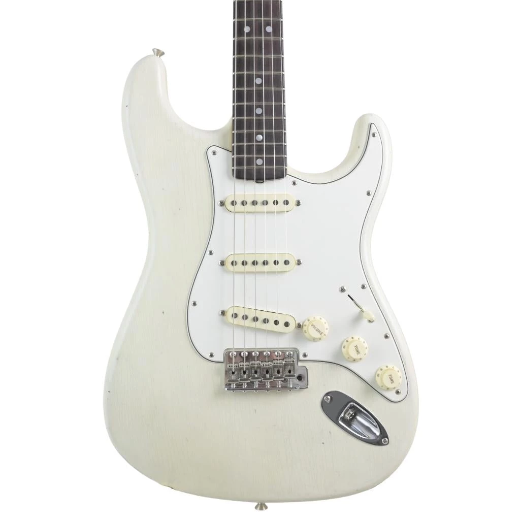 The Fender Custom Shop limited edition ’64 Stratocaster Journeyman relic guitar with closet classic hardware. This features an alder body, rift sawn maple neck, rosewood fretboard, narrow tall frets, and equipped with hand-wound fat ’64 pickups, custom bridge, and vintage tuners in an aged olympic white finish.