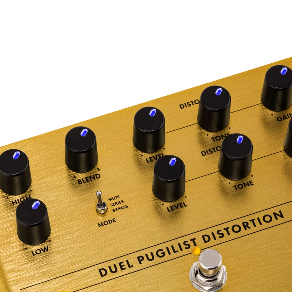 Step into the ring with this one-two punch distortion pedal. The Duel Pugilist features the same distortion voicings found in our popular Pugilist pedal, but with new combinations designed for a knockout. The Duel Pugilist offers three operating modes: Series, Mute and Parallel. Series mode allows stacking the two distortions as you would two separate pedals, while Bypass mode allows blending two different distortions, or a clean sound with a distorted sound. Mute mode offers the ability to use one distortion to create your main tone, and then layer an additional distortion sound on top for added richness and complexity. Also features an added 2-band master shelving EQ.