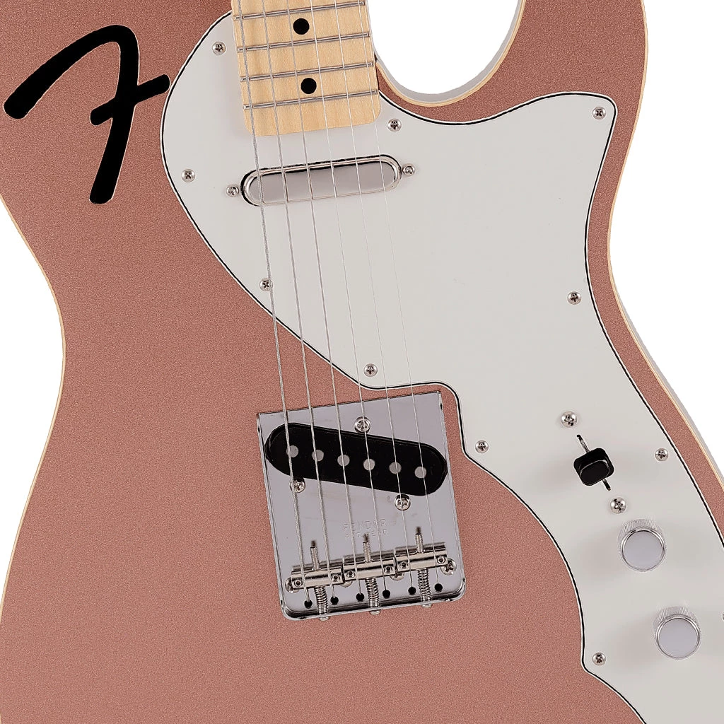 A new meaning to word ‘F-hole’! This Thinline tele, finish in Penny metallic over its ash body is a super special and unique instrument. A combination between a chambered and semi-hollow body, the ‘F’ hole at the upper bout of the guitar gives a unique resonance that doesn’t project too loudly, but feels more alive than a standard solid-body.