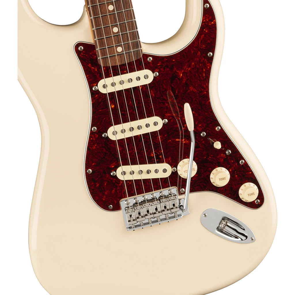 For authentic, vintage-style tone we recreated the trio of single-coil Stratocaster pickups to sound more like the originals. Crystalline and bell-like, they have the crisp, articulate tone that put Fender on the map. The “Mid 60s C”-shaped neck has a 7.25”-radius fingerboard with 21 vintage-style frets for classic playing feel. A vintage-style, six-point synchronized tremolo and vintage-style tuning machines offer original-era aesthetics, rock-solid performance and tuning stability. Other features include vintage-style strap buttons, chrome hardware and four-bolt neck plate. Includes a deluxe gig bag.