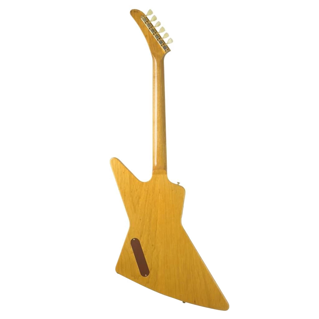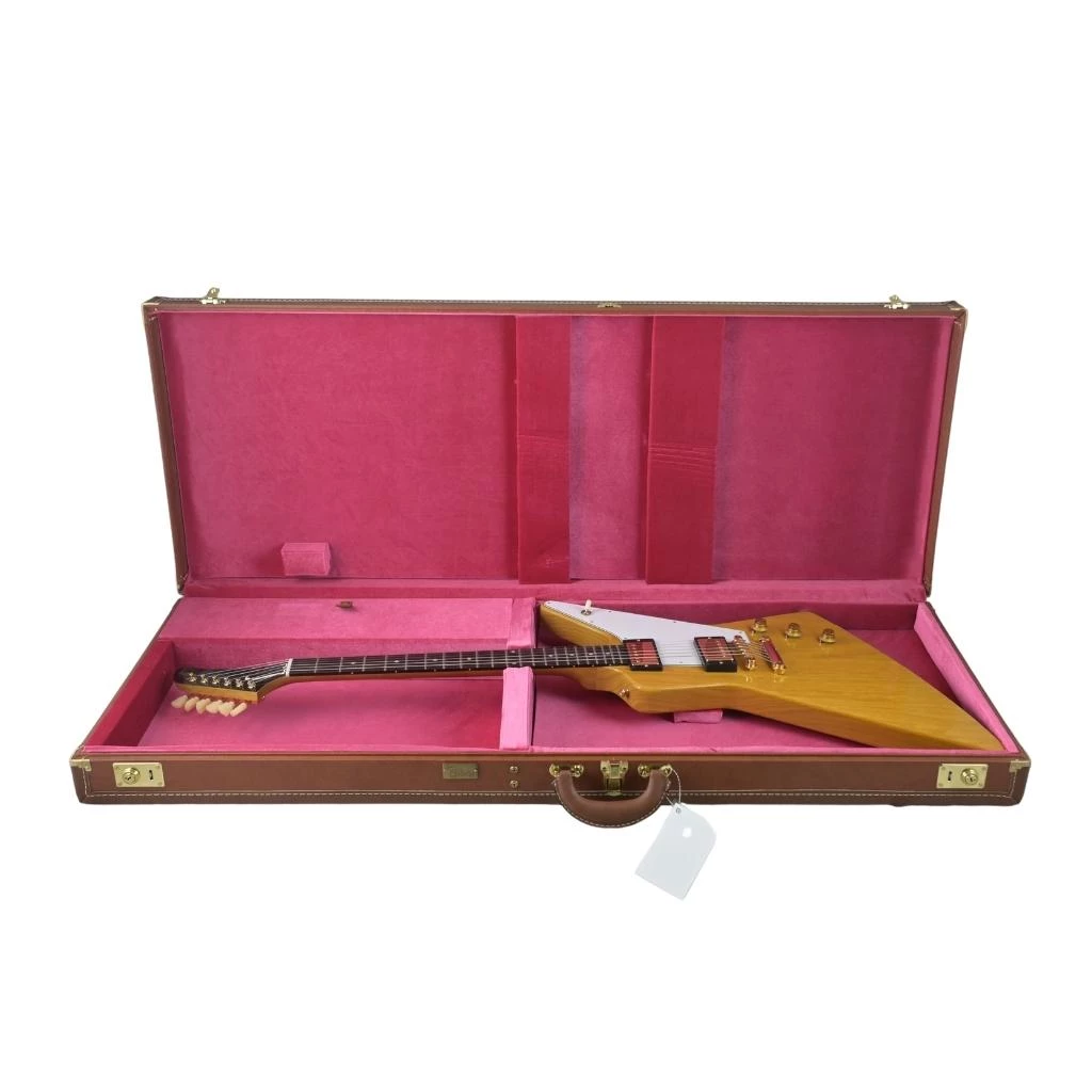 The Gibson Explorer™ was way ahead of its time when it was introduced in 1958, and only 19 were shipped that year, but it has become very popular in the years since then. The classic vintage Explorer features have been carefully recreated in this Historic Reissue model. Featuring an ABR-1 bridge and Stop Bar tailpiece, a korina body, Custombucker pickups, korina neck, Indian rosewood fretboard, two volume and one tone control with CTS® pots and a phone book capacitor, gold hardware, Kluson® tuners, and a 4-ply pickguard. A historically accurate case is included, with a classic brown exterior and plush pink interior.