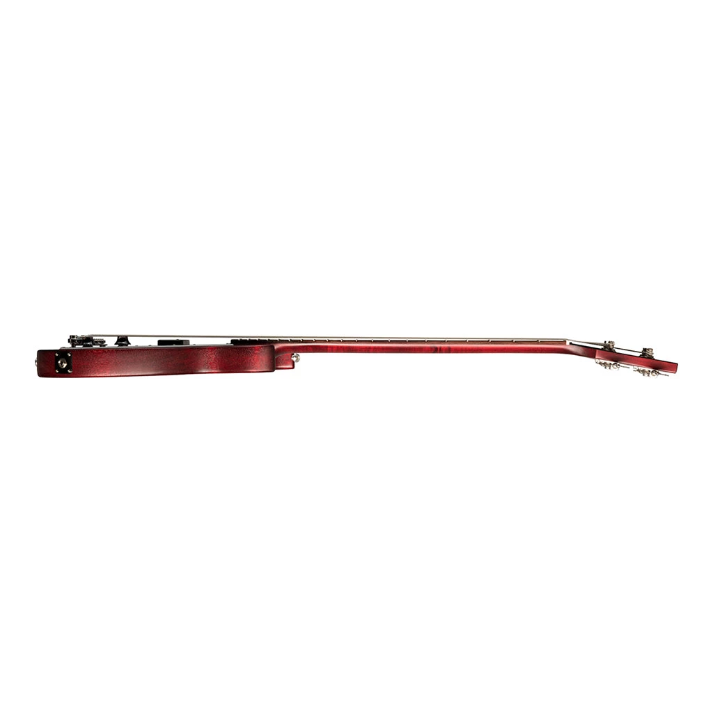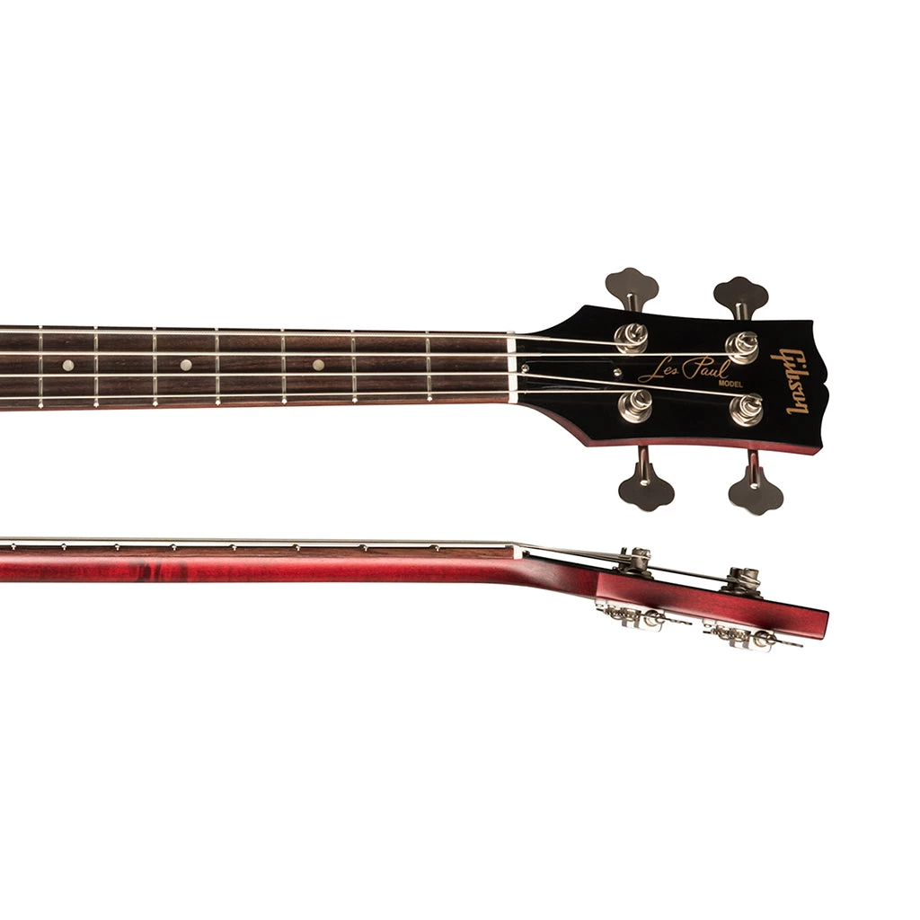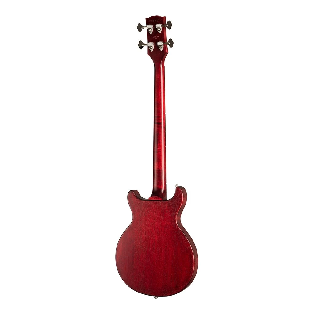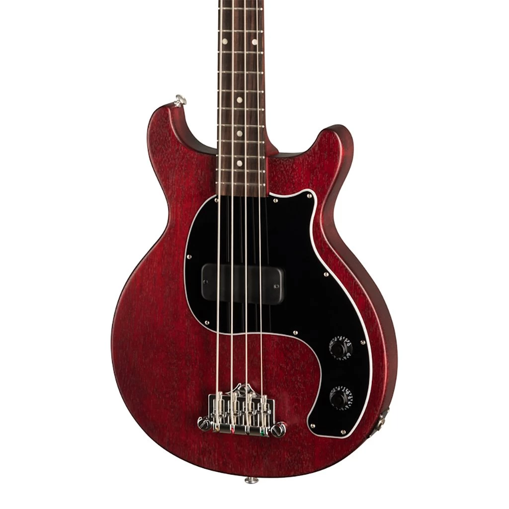 The Les Paul Junior Tribute DC Bass is a tribute to the historic Gibson EB-0 bass from the late 50’s, but with modern features. Not just for smaller players, the short scale length is actually chosen by many for its strong fundamental tone and sits perfectly in a track when recording. The mahogany double cutaway body and maple neck with rosewood fingerboard balances perfectly when playing either sitting or strapped on. It’s equipped with a single expanded range LP BassBucker pickup with single volume and tone controls for simplicity. The volume pot has a push-pull feature to coil tap the pickup scooping the mids for further tone shaping possibilities.