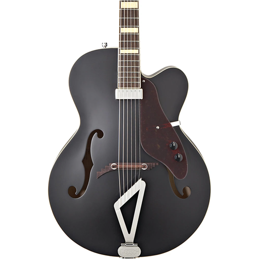 Reminiscent of the early Synchromatic of the 1940s, the G100CE Synchromatic Cutaway acoustic-electric features an arched spruce top with parallel tone bar bracing, body binding, F-holes, three-piece maple neck, bound rosewood fingerboard with extra-broad frets and vintage-style pearloid wide-block inlays, single-coil Gretsch® pickup, pickguard-mounted volume and tone controls, ’40s-era Synchromatic headstock shape and vintage-style pearloid Gretsch headstock logo inlay, height-adjustable Synchromatic bridge and chromatic tailpiece.