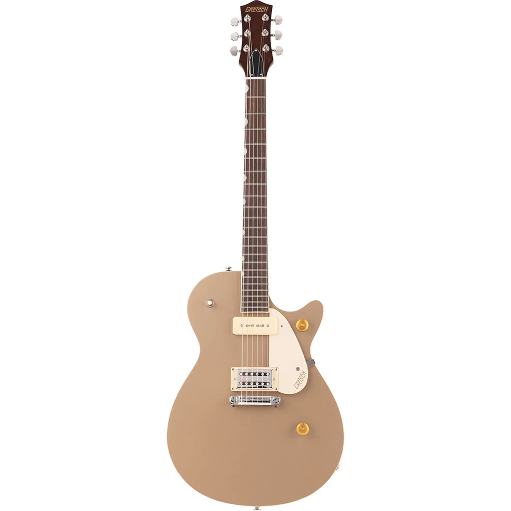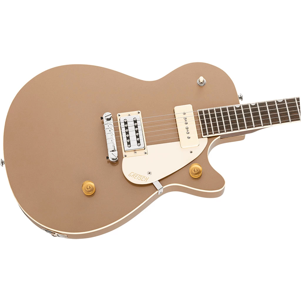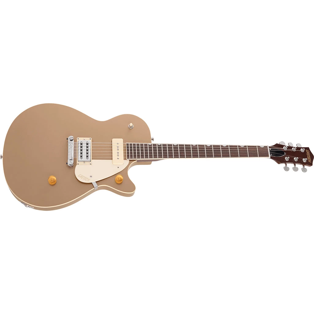 An exciting new addition to the Streamliner™ Collection, the G2215-P90 Streamliner Junior Jet™ Club is a stylish workhouse that’s ready to brawl. Powered by Broad’Tron™ BT-2S bridge and P90 Soap Bar neck pickups, this Streamliner delivers tight lows with a throaty midrange that is harnessed and shaped by a master tone control, master volume control and three-way pickup switching. Bound nato bodies with stunning Mint Metallic, Sahara Metallic and Single Barrel Stain finishes are complemented by effortless mahogany-stained necks that feature 12”-radius laurel fingerboards, elegant pearloid Neo-Classic™ thumbnail inlays and 22 medium jumbo frets. The G2215-P90 also features an anchored compensated wrap-around bridge, gold Electro-style control knobs, cream pickguard and nickel hardware.