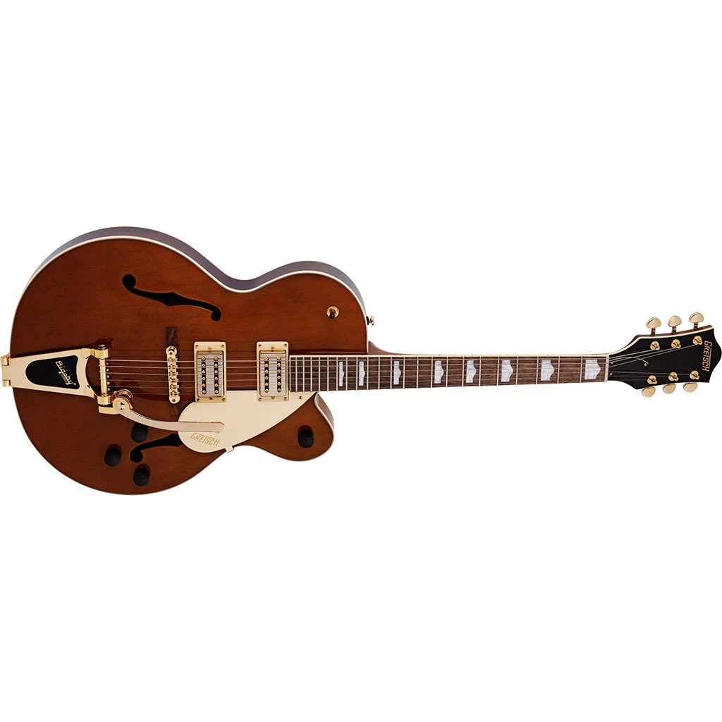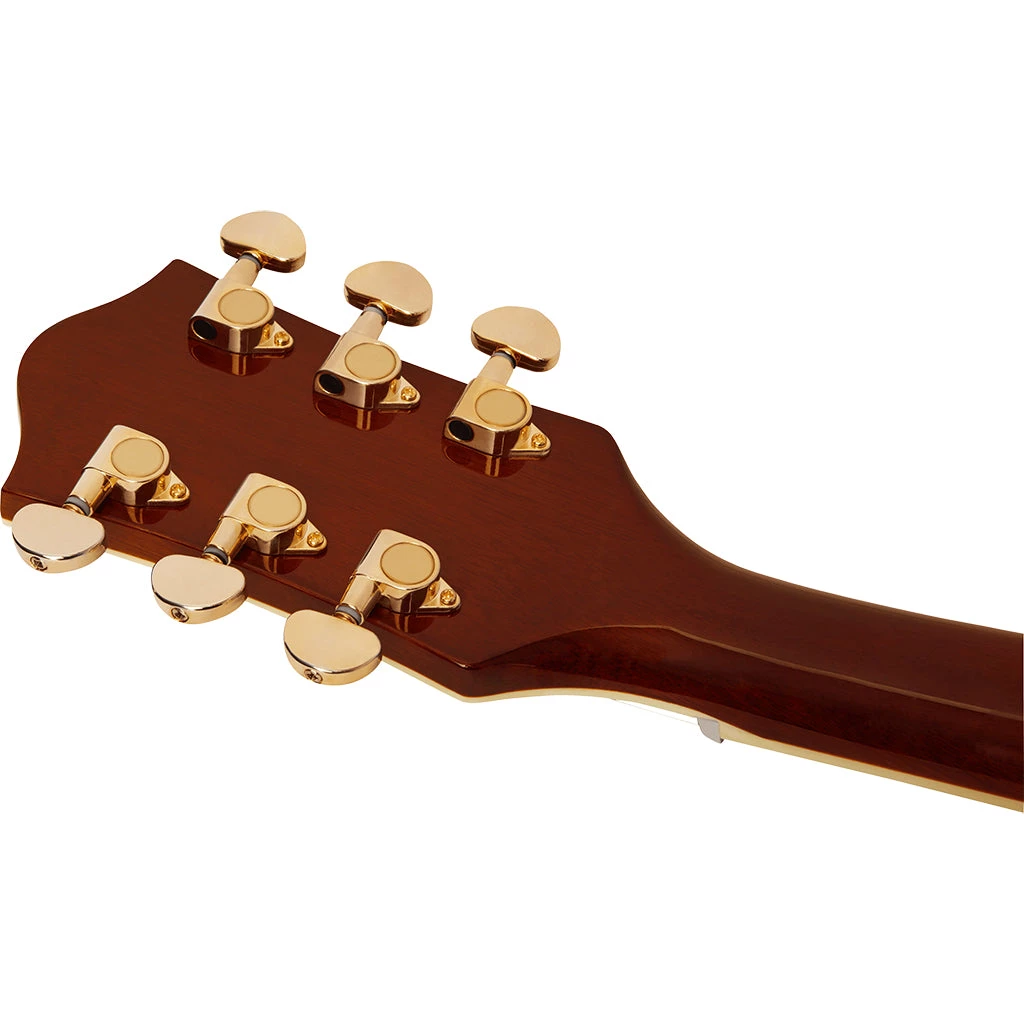 All the classic eye-catching style you’ve come to expect from Gretsch is here—vintage-style black control knobs, enlarged F-holes for increased acoustic projection, elegant aged white binding with upgraded purfling and gleaming gold hardware.