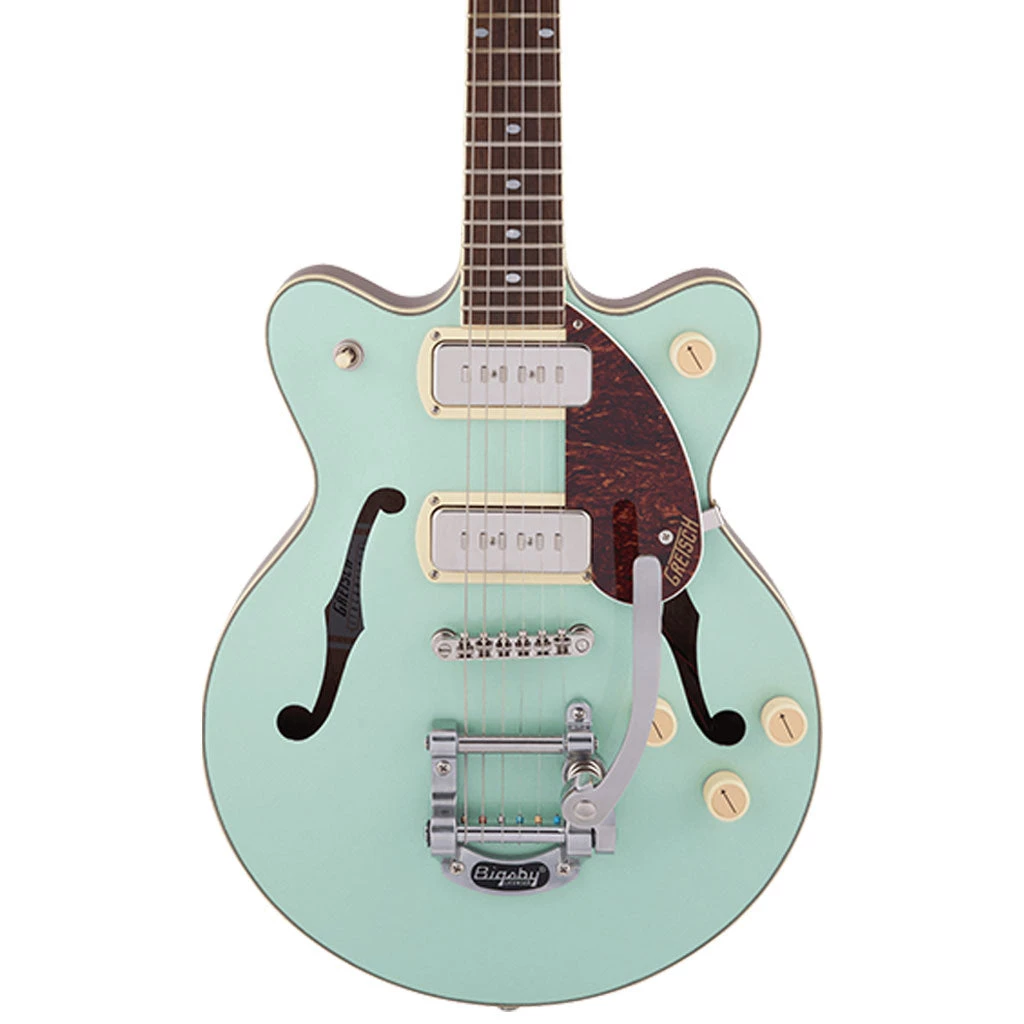 Classic ‘50s and ‘60s Gretsch eye-catching style is also here—all-new “radio arrow” control knobs, enlarged F-holes for increased acoustic projection, stylized pickup bezels, elegant aged white binding with upgraded purfling, one-ply tortoise pickguard, slick-looking nickel hardware and standout finishes including Two-Tone Midnight Sapphire and Vintage Mahogany Stain, Two-Tone Mint Metallic and Vintage Mahogany Stain or Two-Tone Sahara Metallic and Vintage Mahogany Stain. Easy to play while rocking out thanks to its smaller 14” body, the G2655T-P90 is a phenomenal instrument for the modern musician who wants to control the stage and the audience while standing out from the pack.