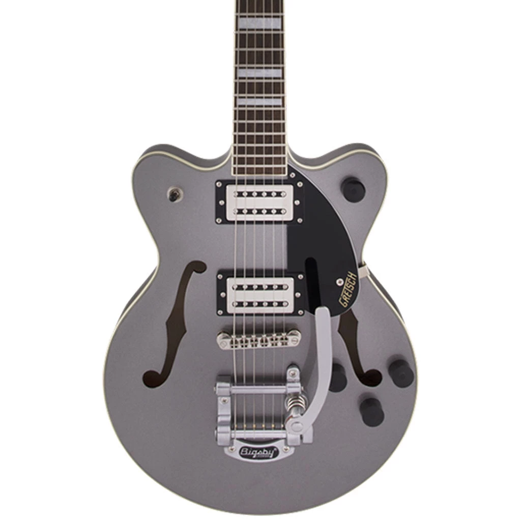 All the classic eye-catching style you’ve come to expect from Gretsch is here—vintage-style black control knobs, enlarged F-holes for acoustic projection, elegant aged white binding with upgraded purfling, slick-looking nickel hardware, three-ply tortoise pickguard and arched laminated maple construction. Easy to play while rocking out thanks to its smaller body, the G2655 is a phenomenal instrument for the modern musician who wants to control the stage and the audience while standing out from the pack.