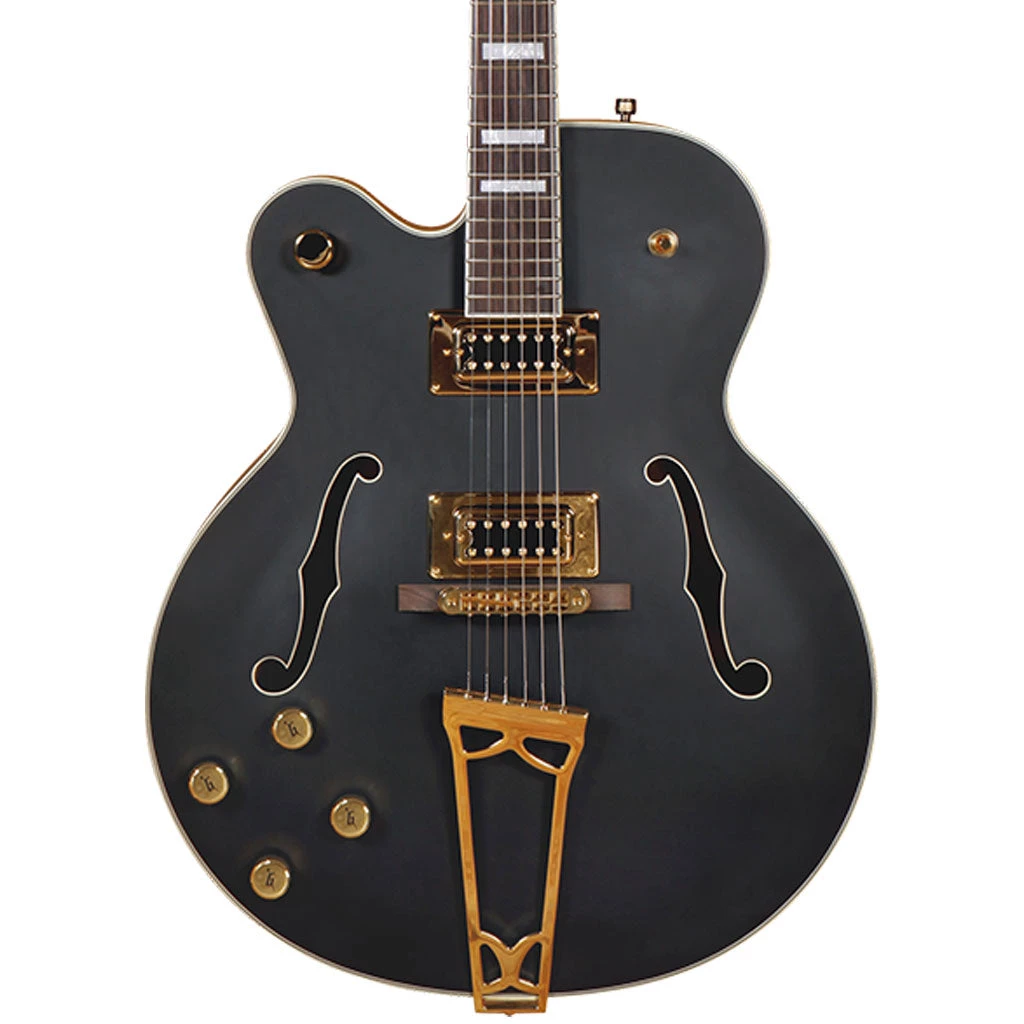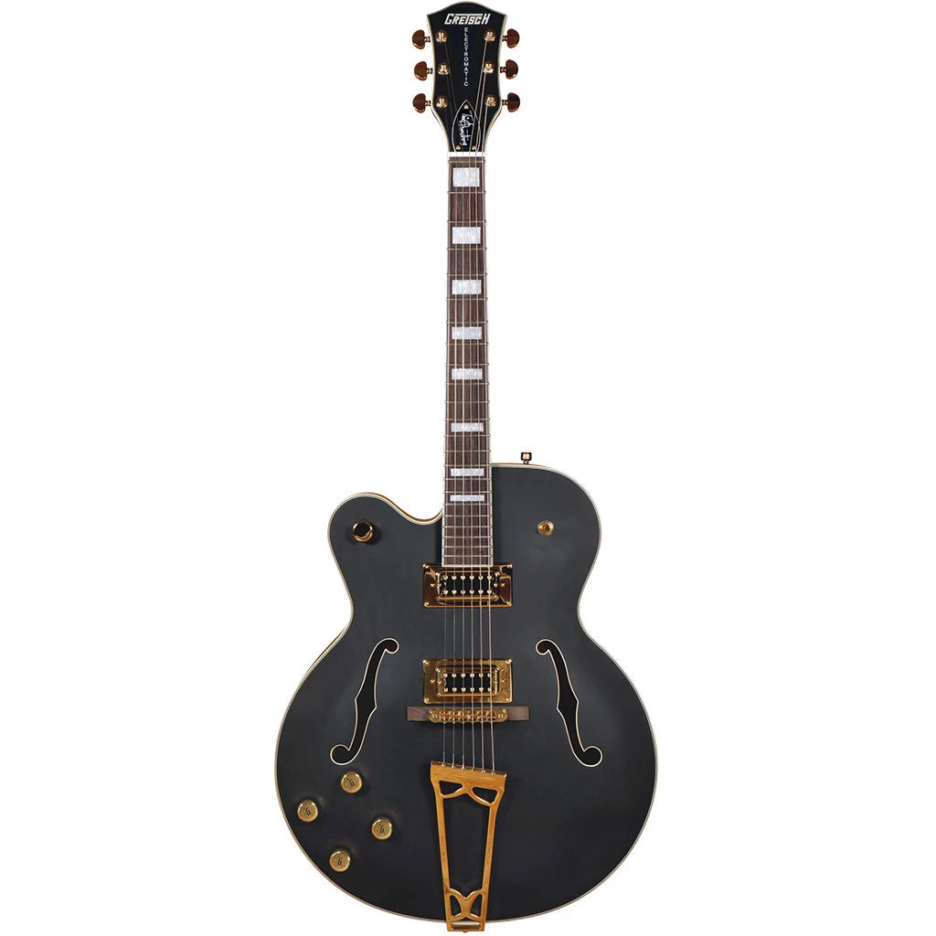 Huge tone resonates from deep within its bound single-cutaway hollow body, which features parallel tone bar bracing with sound post and bound F-holes. The one-piece maple neck has a white graphite nut and bound rosewood fingerboard with acrylic block inlays. Other features include dual Black Top Filter’Tron™ humbucking pickups with gold-plated bezels, three-position pickup switch, gold-plated hardware, bound headstock with pearloid Gretsch inlay and Armstrong’s signature on the truss rod cover, Grover® tuners, Adjusto-Matic™ bridge and harp tailpiece.