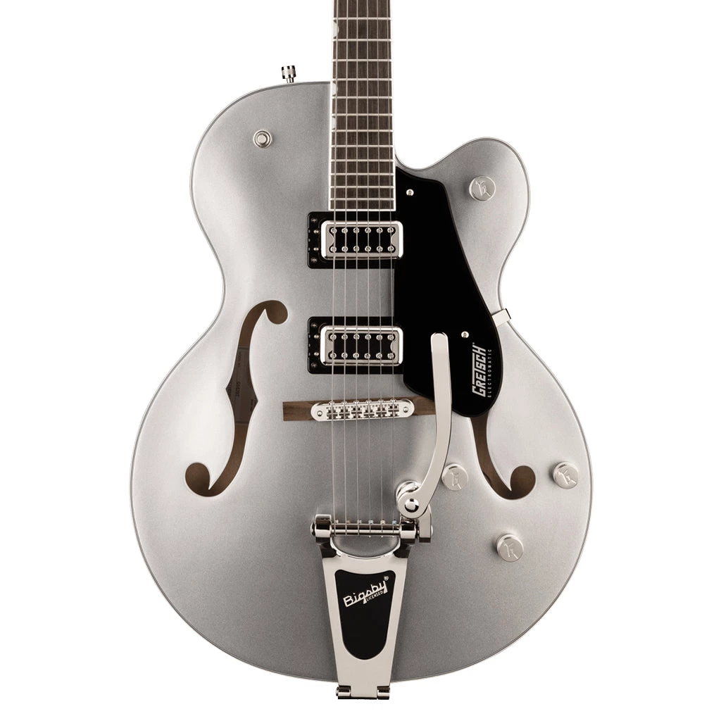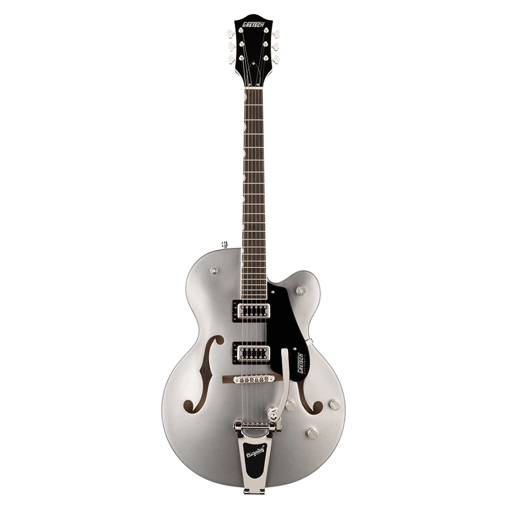 Alive and resonant, the G5420T also features a versatile upgraded control layout including master volume with treble bleed circuit, master tone, individual pickup volume controls and three-position pickup toggle switch, oversized bound F-holes, multi-ply body binding, smaller late-’50s G6120 bound headstock, vintage-style open-back tuning machines, Graph Tech® NuBone® nut, pearloid Neo-Classic™ thumbnail inlays, secured Adjusto-Matic™ bridge and a Bigsby® B60 vibrato tailpiece.