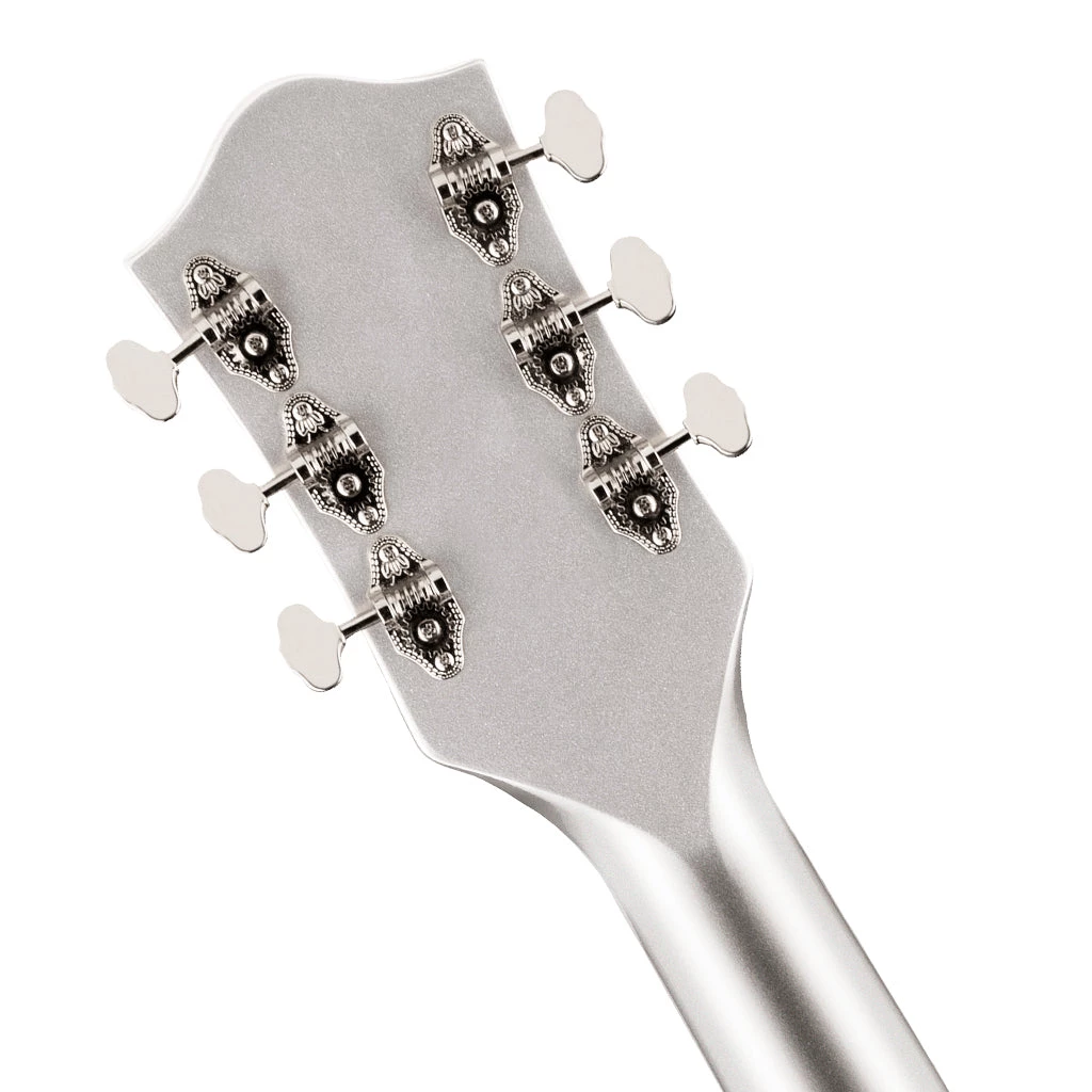 This resplendent instrument comes in a standout Airline Silver with black pickguard and nickel hardware.