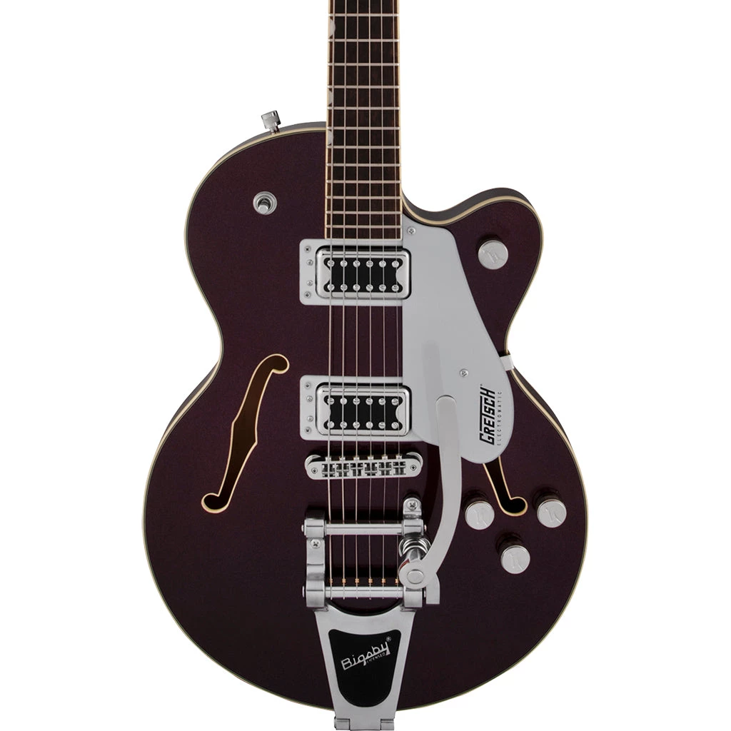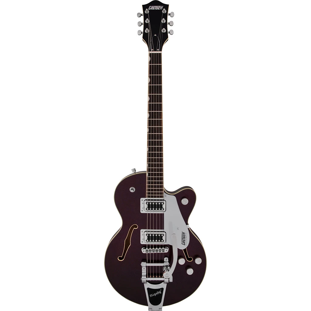 Boasting stage-stealing style, the G5655T is available in Casino Gold, Dark Cherry Metallic or Jade Grey Metallic with a silver pickguard and nickel hardware, including the Bigsby B70 vibrato tailpiece, anchored Adjusto-Matic™ bridge and G-arrow knobs.