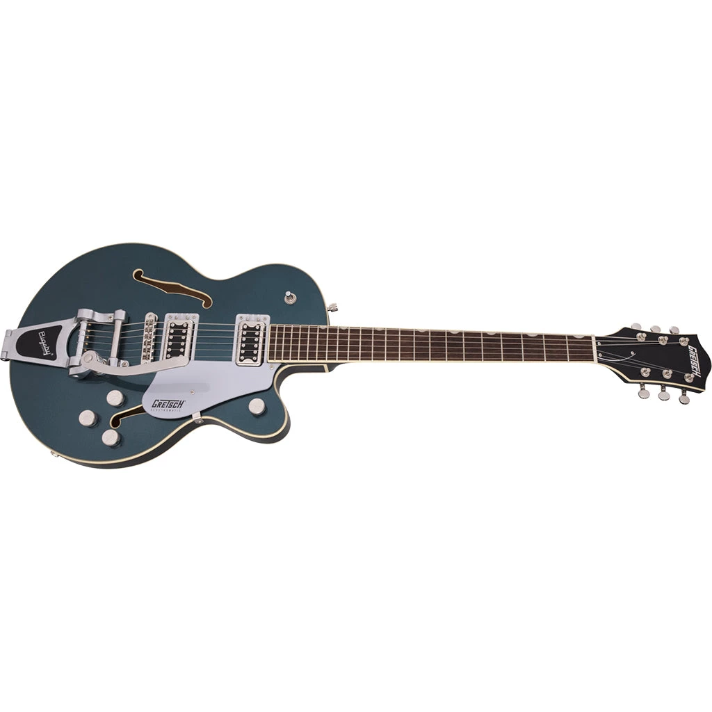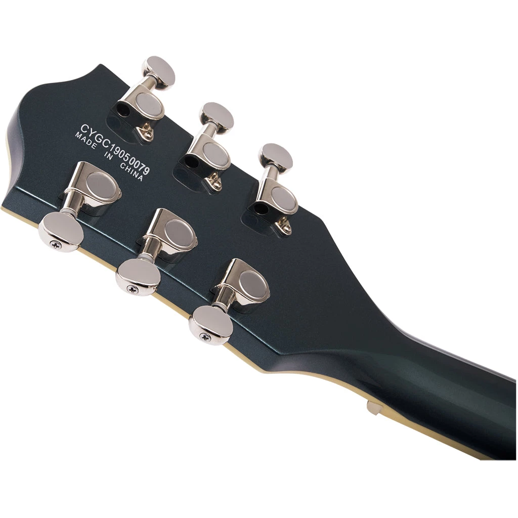 The G5655T Electromatic Center Block Jr. Single-Cut with Bigsby® features a smaller-sized body with a chambered spruce center block for dynamic resonance, high gain power and lightweight comfort. A lower set maple neck offers effortless access and performance, while the 12”-radius laurel fingerboard with 22 medium jumbo frets and Neo-Classic™ thumbnail inlays offers excellent playability.