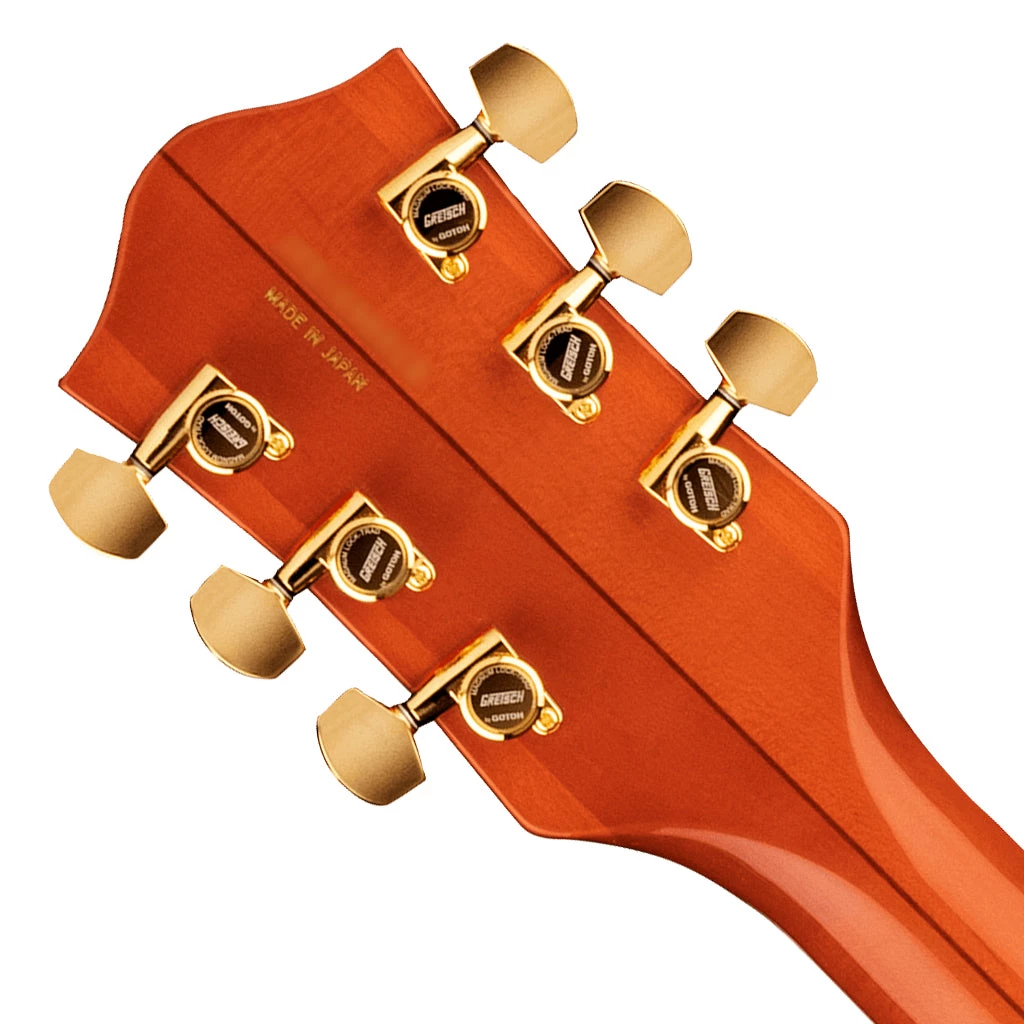 This Nashville is ready to bring Music City style to the stage — from the Azure Metallic or Orange Stain gloss urethane finish to the gold Gotoh® locking tuning machines and gold G-arrow control knobs to the white bound neck, body and F-holes, striking pearloid Neo-Classic™ thumbnail inlays and gold plexi pickguard with black Gretsch logo and Nashville post sign. Built to be a true workhorse every song, every night, the G6120TG Players Edition Nashville Hollow Body with String-Thru Bigsby and Gold Hardware updates the archetypical hollowbody electric guitar for modern players who demand distinction from themselves and their tools.
