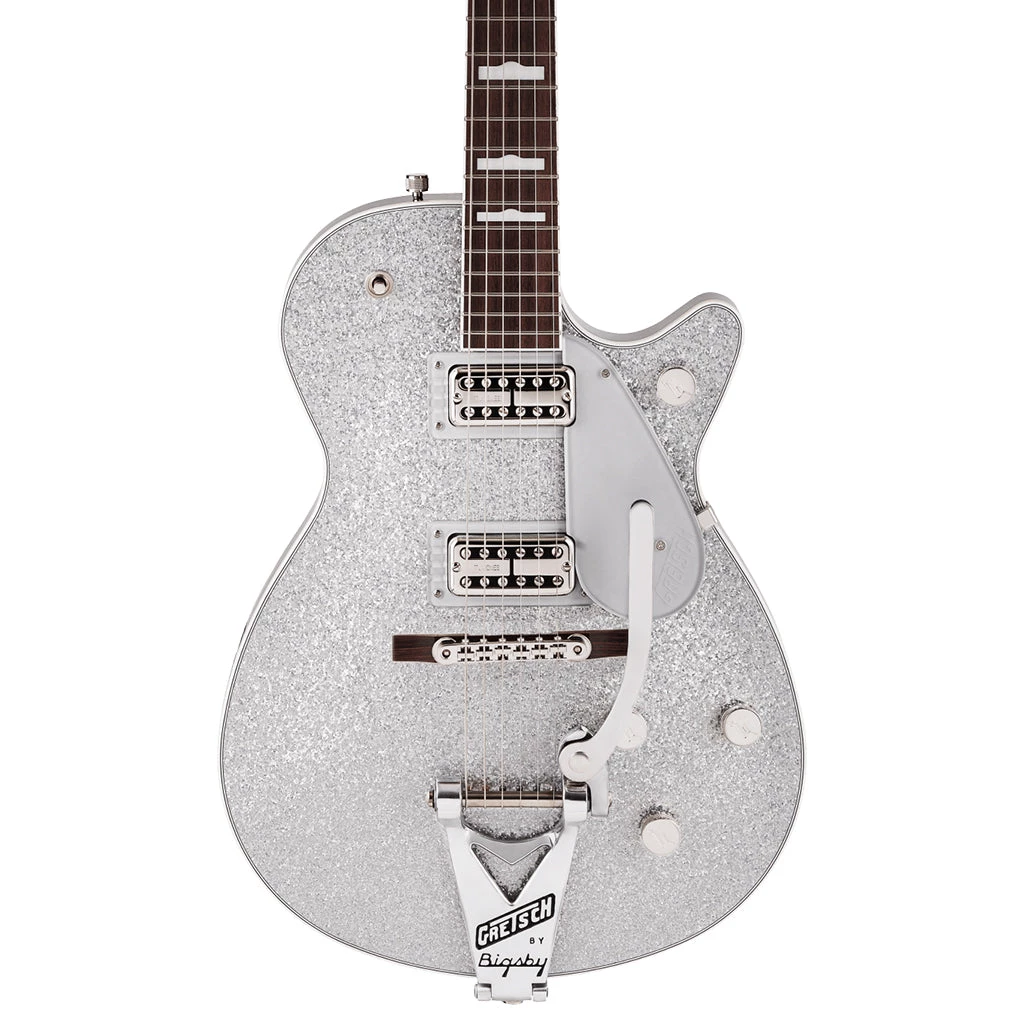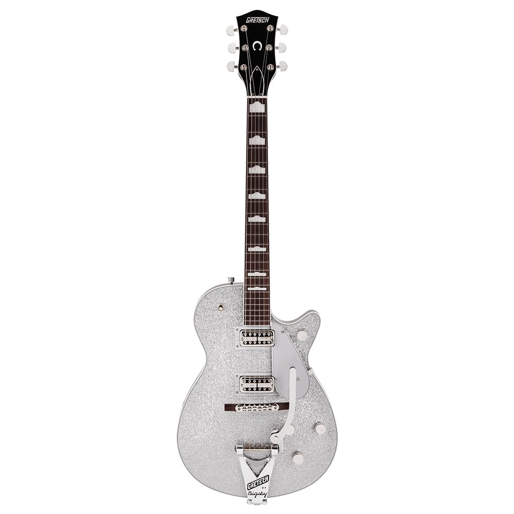 This grunge-era beauty comes in Gold Sparkle or Silver Sparkle finishes with silver pickguard, nickel hardware and late-’80s black headstock with Gretsch logo and horseshoe inlay.