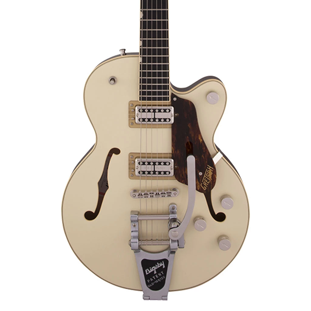 For big sound in a small package, the G6659T Players Edition Broadkaster® Jr. Center Block with Bigsby® features a slightly smaller single-cutaway body for greater comfort, tonal focus and feedback resistance. Two new U.S.-made Full’Tron™ pickups deliver full-spectrum sonic range with a growl unlike any other pickup, in addition to classic Gretsch® chime, balance and brilliance with a dash of extra-mid concentration for powering through overdriven and distorted passages at full volume.