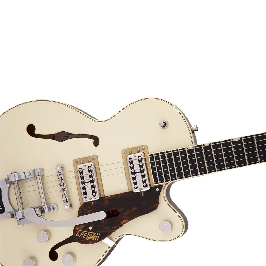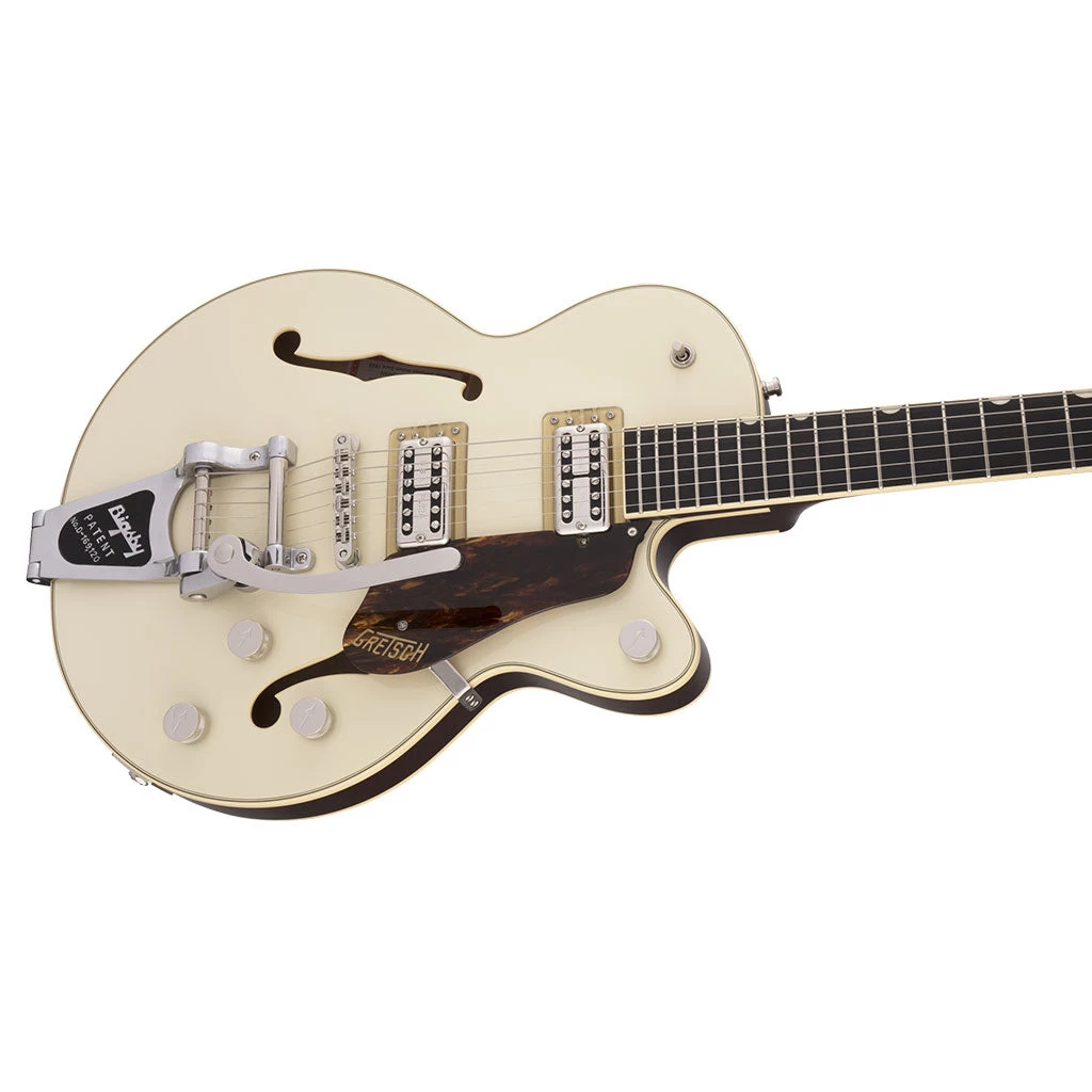 The G6659T is available in three fashionable Gretsch finishes — Round-Up Orange with matching headcap and tortoise pickguard, Two-Tone Ivory/Walnut Stain with tortoise pickguard and Walnut Stain headcap, or Two-Tone Smoke Green with Smoke Green pickguard and headcap. All finishes feature nickel hardware.